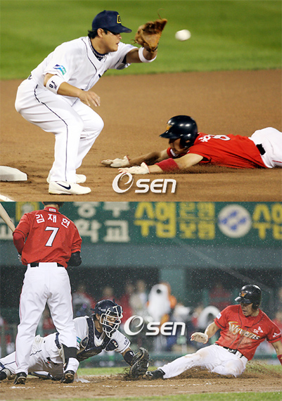 SK의 '주루 반격'이 시작됐다. SK의 적극적인 주루 플레이가 살아났다. 1차전과 2차전에서 숨을 죽였던 SK의 발이 3차전에서는 활발해졌다. 향후 경기에서 SK 특유의 발야구가 시작되는 조짐을 보인다. 수세에 몰렸던 SK의 주루 반격이 앞으로 힘을 발휘한다면 시리즈의 향방이 달라질 수 있다. SK는 1차전에서는 이종욱의 발에 무참히 쓰러졌다. 이종욱은 그라운드를 자기 집처럼 누비고 다녔다. 2차전에서는 두산의 발을 묶었지만 홈런포와 선발 채병룡이 김동주와 신경전을 벌이다 무너지는 통에 패배를 곱씹었다. 하지만 3차전은 달랐다. 톱타자 정근우가 2개의 그림같은 주루플레이를 선보였다. 1회초 빗맞은 안타로 출루하자마자 후속타자의 3루 땅볼 때 2루를 찍고 3루까지 파고드는 솜씨가 나왔다. 이 하나의 주루플레이가 2득점의 발판을 놓았다. 정근우는 6회 7-0으로 앞선 가운데 홈스틸까지 감행했다. 김성근 감독도 몰랐다. 이광길 3루코치와 상의, 홈을 노렸다. 이혜천이 셋포지션이 아닌 와인드업으로 투구하는 점을 노렸다. 깜짝 놀란 두산 포수 채병룡이 볼을 뒤로 빠트려 기록은 포수 패스트볼이 됐다. 하지만 2루주자까지 홈에 들어오는 계기가 됐다. 김성근 감독은 "아마 이광길 코치와 이야기해서 홈을 노렸을 것이다. 이혜천의 투구폼이 크기 때문에 미리 연습한 것으로 알고 있다"고 말했다. 아울러 3차전에서 2개의 도루를 성공시키는 등 SK는 순수한 발대결에서 1승1패를 한 셈이다. 특히 SK 발야구는 두산의 4차전 선발 리오스와 5차전 예상 선발 랜들과 대결을 갖는다. 1,2차전에서는 리오스와 랜들은 주자가 있을 경우 평소보다 퀵모션이 빨라져 애를 먹었다. 김성근 감독은 "두 선수 모두 1.1초대에서 피칭을 마치고 있다. 이 정도의 기록이면 뛰는 것은 무리다"고 말했다. 두 투수를 넘어야만 시리즈 역전을 노릴 수 있다. 살아난 SK의 발이 돌파구를 마련할 수 있을지 주목된다. sunny@osen.co.kr