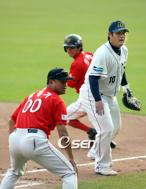 2007 프로야구 두산 베어스와 SK 와이번스의 한국시리즈 5차전 경기가 27일 잠실야구장에서 벌어져 8회초 고영민의 악송구 생긴 찬스에서 4득점한 SK가 두산을 4-0으로 물리치고 한국시리즈 우승에 1경기를 남겨 놓았다. 8회초 조동화의 안타성 타구를 다이빙캐치한 고영민이 1루에 악송구하자 조동화가 2루로 달리고 있다./잠실=손용호 기자spjj@osen.co.kr