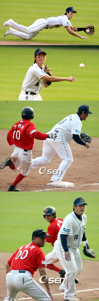 2007년 두산의 최고 히트상품은 고졸 6년차 내야수 고영민(23)이었다. 올 시즌 반달곰 군단의 붙박이 2루수로 낙점돼 126경기에 출장, 타율 2할6푼8리(444타수 119안타) 12홈런 66타점 89득점 36도루로 지난해보다 업그레이드된 방망이는 물론 독특하고 완벽에 가까운 수비를 선보이며 '2익수' 또는 '고제트'라는 애칭까지 얻었다. 데뷔 후 최고의 한 해라고 평가해도 과언이 아닐 정도. 그러나 고영민은 지난 27일 잠실구장에서 벌어진 SK와의 한국시리즈 5차전에서 제대로 스타일을 구겼다. 수 차례 득점 찬스를 무산시킨 것을 물론 보이지 않는 실책까지 범해 팀의 0-4 패배에 한 몫(?) 했다. 1회 좌전 안타로 기분 좋은 출발을 보였지만 3회 2사 1,2루에서 중견수 뜬 공으로 물러난 뒤 5회 2사 1,3루에서도 삼진으로 고개를 떨궈야 했다. 8회 조동화의 내야 땅볼을 1루로 악송구하는 바람에 결승 득점의 빌미를 제공한 고영민은 0-4로 뒤진 8회 김현수의 중전 안타로 만든 1사 1루서 2루수-유격수-1루수로 이어지는 병살타를 때렸다. 0-0의 균형을 지속하던 양팀은 8회 고영민의 보이지 않는 실책으로 1점을 내준 것을 비롯해 4점을 허용하며 0-4로 패했다. 만약 고영민이 득점 찬스에서 적시타를 날려줬다면 이날 승부는 달라졌을지도 모른다. 두산은 고영민의 부진 속에 안방에서 3연패의 수모를 겪은 셈이다. what@osen.co.kr 고영민이 5차전서 조동화의 타구를 다이빙캐치한 뒤 1루에 악송구, 2루까지 진루를 허용하고 있다.