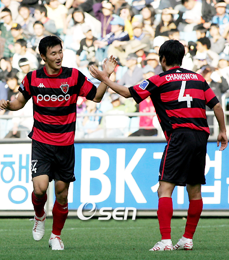 포항의 중앙 수비수 황재원(26)은 K리그에서 머리 쓰는 플레이에 있어서는 최고 레벨이다. 186cm의 장신을 자랑할 뿐만 아니라 점프력과 위치 선정이 좋아 상대 공격수와의 공중볼 다툼에 있어서 좀처럼 지지 않는다. 여기에 세트 피스 상황에서 종종 헤딩골을 뽑아내며 팀에 큰 도움을 주는 황재원은 포항에게 있어 큰 보배나 다름없다. 28일 울산 문수 월드컵 경기장에서 열린 K리그 준플레이오프 울산과 포항과의 경기에서도 황재원의 '머리쓰는' 플레이는 빛났다. 황재원은 191cm의 장신을 자랑하는 베테랑 스트라이커 우성용(34, 울산)을 전담 마크했다. 우성용과의 헤딩 경합에서 승리한 황재원은 울산의 주 공격루트인 우성용의 헤딩에 이은 2차 공격을 반감시키는 데 크게 기여했다. 황재원의 이같은 활약에 김정남 울산 감독은 어쩔 수 없이 후반 들어 염기훈(24)을 투입시키며 공격 전술을 바꿀 수 밖에 없었다. 황재원의 활약은 비단 수비에만 한정된 것이 아니었다. 황재원은 세트 피스에 적극 가담했고 그 결과 팀의 귀중한 선제골을 안겼다. 전반 34분 황재원은 따바레즈의 프리킥을 헤딩골로 연결해 팀에게 승리를 안겼다. 올 시즌 들어 자신을 주전 수비수로 기용해준 파리아스 감독에게 큰 선물을 안기는 순간이었다. bbadagun@osen.co.kr 전반 34분 헤딩으로 선제골을 성공시킨 황재원(왼쪽)이 이창원과 하이파이브를 나누고 있다. /울산=황세준 기자 storkjoon@osen.co.kr