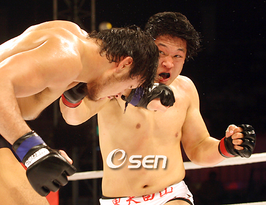 '폭주 기관차' 허민석이 일본 선수를 꺾고 히어로스 데뷔전서 첫 승을 따냈다. 또 김대원은 가르시아 마르셀로와 경기서 2라운드 TKO승을 거두었다. 27일 서울 장충체육관에서 열린 히어로스 코리아 2007서 허민석은 시바타 가쓰요리를서 시종일관 몰아붙인 끝에 KO승을 거두었다. 경기 초반 양 선수는 난타전을 벌였다. 특히 허민석은 '광견'이라는 별명을 가진 시바타에 전혀 밀리지 않는 경기 내용으로 앞서갔다. 1라운드 중반 상대를 링에 눕힌 허민석은 파운딩을 통해 상대의 체력을 소모 시켰다. 이어진 2라운드서도 허민석의 공세는 여전했다. 특히 펀치와 체력 등 모든 면에서 앞선 허민석은 2라운드 중반 강력한 펀치를 날리며 시바타를 링에 쓰러뜨렸다. 결국 심판이 경기 중단을 외치며 KO승을 거두었다. 김대원과 마르셀로 가르시아의 경기는 초반부터 난타전으로 흘러갔다. 특히 경기 초반 상대의 공격에 수비지향적인 모습을 보인 김대원은 1라운드 중반까지 밀리는 모습이었다. 하지만 김대원의 진가는 라운드서 나타났다. 웅크리며 기회를 엿보던 김대원은 이후 상대의 안면에 펀치를 집중시키며 기세를 올렸고 결국 많은 출혈을 보인 가르시아에 2라운드 TKO승을 거두었다. 한편 미국 격투기 대회인 UFC 챔피언 출신 카를로스 뉴튼은 일본의 오야마 슌고에 시종일관 밀린 끝에 2라운드 TKO패를 당했다. 10bird@osen.co.kr 허민석이 2라운드서 시바타를 거세게 밀어붙이고 있다./장충체=손용호 기자spjj@osen.co.kr