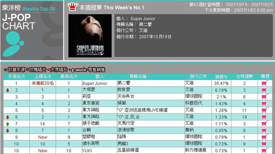 2집 앨범 발표 후 각종 차트에서 1위를 차지하고 있는 슈퍼주니어가 대만에서도 음반판매차트를 석권하는 기염을 토했다. 슈퍼주니어 2집 '돈 돈! (Don’t Don)’은 지난 19일 대만 현지에서 발매된 후 일주일 만에 G-MUSIC 風雲榜(펑윈방), FIVE MUSIC 등 음반판매집계차트에서 1위에 올랐다. G-MUSIC 風雲榜(펑윈방)은 대만 최고의 음반 판매량 집계차트로, 슈퍼주니어는 19일부터 25일까지 일주일 간의 판매량을 집계한 10월 넷째 주 아시아 음악차트에서 1위를 차지했다. 26일 발표된 이번 차트에서 슈퍼주니어 2집은 아시아음악뿐만 아니라 중국, 서양 음악을 모두 합친 종합차트에서도 3위에 올랐다. 또한 대만의 대규모 음반체인점 FIVE MUSIC에서 집계하는 음반판매량 주간차트(10월 19일 ~10월 25일)에서도 당당히 아시아앨범 부문 1위를 차지했다. 한편 슈퍼주니어는 11월 1일 Mnet '엠카운트다운', 3일 MBC '쇼 음악중심', 4일 SBS '사랑나눔콘서트' 등에 출연해 2집 타이틀곡 '돈 돈!(Don't Don)'의 멋진 무대를 선사할 예정이다. hellow0827@osen.co.kr G-MUSIC 風雲榜(펑윈방) 차트/SM 제공