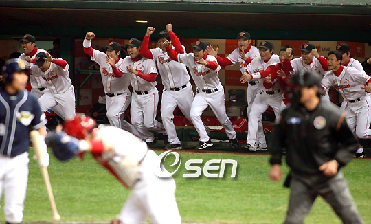2007 한국시리즈 우승컵은 SK 와이번스의 품에 안겼다. SK는 29일 인천 문학야구장에서 벌어진 6차전에서 두산에 5-2로 승리, 2패 뒤 4연승을 하는 대역전극으로 창단 후 첫 한국시리즈 우승을 차지했다. 마지막 타자 이종욱을 삼진으로 잡자 덕아웃에 있는 선수들이 만세를 부르며 마운드로 향하고 있다./인천=손용호 기자spjj@osen.co.kr