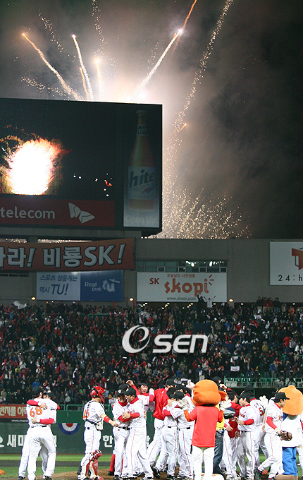 "내년엔 100만 관중 넘겨 보죠". SK 와이번스의 창단 첫 우승이 이뤄지자 공식 홈페이지의 팬 포럼 '용틀임 마당'엔 축하의 물결이 쇄도하고 있다. 우승 확정 하루 뒤인 30일 오전까지 'SK 와이번스의 창단 첫 우승을 축하합니다'란 팬들의 릴레이 문구는 이미 120여 건을 돌파한 상태다. 이밖에 팬들은 다양한 축복 메시지로 SK 팬으로서의 행복감을 만끽했다. 안원일이란 팬은 '올해 98%의 관중성장을 했습니다. 내년에 관중 100만 명 함 넘겨 보죠. 한국 프로야구 최초로 단일팀 관중 100만 명 넘겨 보자고요. 가족과 함께, 친구와 함께, 애인과 함께, 동창들과 함께, 야구장에 지금 온 것보다 1배씩만 더 오면 100만 관중입니다'라고 썼다. 정하나란 팬은 어제 제가 보기엔 관중 초과였습니다. 어떻게 계단에 자리가 없을 수가 있습니까? 외야 계단도 꽉 찼더군요. 간만에 외야에서 봤는데 그렇게 멋질 수가 없습니다. 관중들의 모습이 너무너무 멋져서 탄성이 절로 나왔습니다. 감사합니다 우리 선수들. 정말 너무너무 감사합니다. 이렇게 행복한 팬을 만들어줘서'라고 썼다. 이밖에도 'SK 팬이어서 너무 행복하다', '우승해서 잠도 안 온다. 내년 4월까지 SK 야구없이 어떻게 버틸지 고민이다'란 애정어린 문구가 넘쳤다. 유럽에서 우승 축하 메시지가 날아오기도 했고, '드디어 인천이 우승팀을 갖게 됐다'란 감개무량을 표현하는 팬도 있었다. 또한 어떤 두산 팬은 'SK의 우승을 축하한다'라는 메시지를 남겨 SK 팬들과 화해의 장을 만들기도 했다. sgoi@osen.co.kr