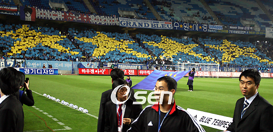 수원 삼성의 서포터스인 '그랑블루'가 화려한 카드섹션으로 올 시즌 K리그 우승을 기원했다. 31일 수원 월드컵경기장에서 열린 삼성 하우젠 K리그 2007 수원 삼성과 포항 스틸러스의 플레이오프는 많은 볼거리로 팬들의 이목이 집중됐다. 경기 시작 전부터 많은 N석을 꽉채운 수원 서포터스 '그랑블루'는 이날 대단한 카드섹션을 준비했다. '★★★★'을 서포터스석에 수놓아 장관을 연출했다. 특히 이날 카드섹션은 중간에 '★전진★'으로 변하는 모습을 보이며 그 화려함이 극치를 달렸다. 그동안 열정적인 응원과 함께 선행을 펼치며 많은 칭찬을 받아온 '그랑블루'는 이날도 자신들의 응원하는 수원이 승리를 거둘 수 있도록 많은 응원을 했다. 한편 원정팀 포항은 평소보다 많은 서포터들이 찾아와 선수들의 등번호가 적힌 깃발을 들고 선수들에게 기를 불어넣기 위해 노력했다. 10bird@osen.co.kr