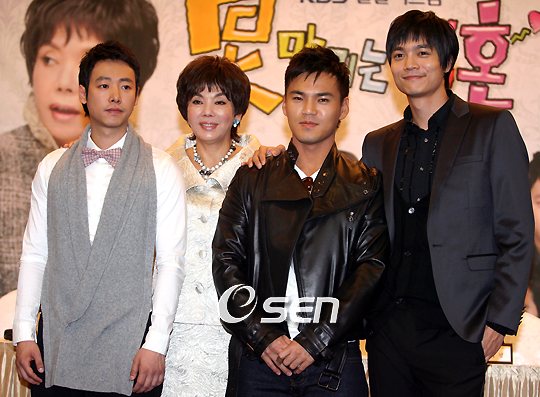 KBS 새 일일시트콤 '못 말리는 결혼'의 제작발표회가 1일 서울 여의도 렉싱턴 호텔에서 열렸다. '못 말리는 결혼'은 먼저 영화로 소개돼 임채무 김수미 유진 윤다훈 등이 출연했고 드라마에서는 임채무 김수미가 그대로 출연하고 안연홍 등 나머지 배우들은 모두 교체돼서 선보인다. 김수미가 드라마에서 가족으로 나오는 김동욱 이정 서도영(왼쪽부터)과 함께 포토타임을 갖고 있다./손용호 기자spjj@osen.co.kr