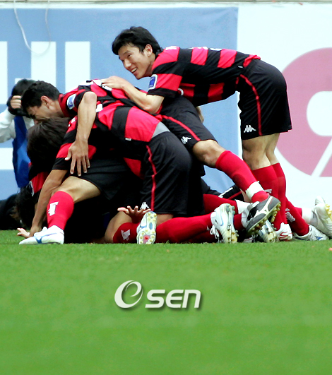포항 스틸러스가 성남 일화를 물리치고 2007년 K리그 챔피언 등극에 유리한 고지를 선점했다. 포항은 4일 포항 스틸야드에서 열린 K리그 챔피언결정전 1차전에서 1골 1도움을 기록한 박원재의 맹활약에 힘입어 성남을 3-1로 눌렀다. ▲ 축제 분위기에서 시작된 경기 경기장은 포항 지역 축제의 한마당이었다. 경기 시작 한두 시간 전부터 스틸야드로 향하는 도로는 정체를 빚기 시작했다. 포항 시민들은 포항의 검고 붉은색 줄무늬의 유니폼을 입고 경기장으로 향했다. 포항에 주둔하고 있는 해병대도 붉은 색 해병티셔츠를 입고 포항을 응원했다. 선수들이 입장할 때는 2만 여 관중들은 휴지폭탄을 던지며 장관을 연출했다. ▲ 강하게 맞부딪친 양 팀, 일진일퇴의 공방 양 팀은 초반부터 서로 강하게 맞부딪혔다. 초반 기싸움에서 지면 경기를 어렵게 할 것이라고 판단한 것. 양 팀 선수들은 몸과 몸을 격렬하게 부딪히면서 전의를 붙태웠다. 성남은 전반 4분 남기일과 14분 손대호의 슈팅으로 포항을 공략했다. 포항은 19번 따바레즈가 감각적인 오른발 슈팅을 날렸고 21분에는 오른족 엔드라인을 파고든 슈벵크가 개인기로 돌파한 후 슈팅을 날렸으나 김용대의 선방에 막혔다. ▲ 박원재의 선제골, 앞서나가는 포항 경기는 포항의 우세 속에 날카로운 성남의 역습으로 진행되어녔고 이런 양상이 고착될 무렵 박원재의 첫 골이 터졌다. 이번 플레이오프 들어 위력을 발휘하고 있는 세트피스에서 나온 골이었다. 전반 31분 미드필드 지역 좌측에서 따바레즈가 강하게 회전을 준 프리킥이 공격수와 수비수의 경합 속에 골포스트를 맞고 나왔다. 이것을 박원재가 왼발 슈팅으로 연결해 골을 뽑아낸 것. 지난 수원과의 플레이오프에 이어 2경기 연속골이었다. 선제골이 터지자 포항은 더욱 기세를 올렸다. 전반 34분과 42분 포항은 좋은 찬스를 잡았으나 골대를 조금씩 빗나가며 아쉬움을 삼켰다. 성남은 공격에 힘을 실었으나 포항의 압박에 막히며 좋은 찬스를 만들어내는데 실패했다. ▲ 성남의 파상공세, 골대와 수비에 걸려 후반 들어 성남은 파상공세를 펼쳤다. 포항이 센터백들과 크게 전진한 윙백의 조그마한 틈을 노린 것이다. 그러나 골운이 따르지 않았다. 성남으로서는 남기일이 날린 회심의 오른발 슈팅이 크로스바에 맞은 후반 13분이 너무나 아쉬운 상황이었을 것이다. 성남의 파상공세를 잘 넘긴 포항은 역습으로 나섰다. 후반 6분과 9분 슈벵크의 슈팅이 김용대에게 막혔다. 24분에는 따바레즈의 코너킥을 고기구가 헤딩슛으로 연결했으나 골대를 살짝 넘기고 말았다. ▲ 포항의 집중력 높은 공격, 추가골에 이은 쐐기골까지 후반 중반이 넘어가면서 성남은 김동현, 한동원을 투입하며 공격에 힘을 실었다. 하지만 이는 뒤짚어 보면 그만큼 수비가 엷어졌다는 뜻. 포항은 이것을 놓치지 않았다. 후반 28분 박원재가 왼쪽에서 올린 크로스를 고기구가 페널티 에어리어 안에서 감각적인 헤딩골로 연결하며 추가골을 만들어냈다. 추가골의 기쁨이 채 가지기도 전인 후반 29분 포항의 골이 또 터졌다. 최효진의 오른발 슈팅이 수비 맞고 크게 튀어올랐고 이것을 고기구가 헤딩슛으로 연결한 것. 이 슈팅은 크로스바에 맞은 뒤 쇄도하던 이광재 앞에 떨어졌고 세 번째 골로 연결됐다. 이후 성남은 2차전을 위해 한 골이라도 만회하려 애썼다. 그 결과 마지막 순간 장학영이 한 골을 추격했지만 승부를 뒤집을 수는 없는 시점이었다. 2차전은 오는 11일 오후 3시 성남의 홈인 탄천 종합 운동장에서 열린다. bbadagun@osen.co.kr