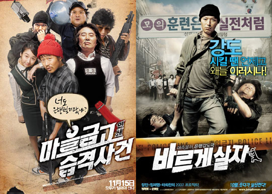 영화 ‘바르게 살자’와 ‘마을금고 연쇄 습격사건’은 은행강도를 소재로 한정된 공간에서 펼쳐지는 이야기라는 점이 공통점이다. 2주 연속 박스오피스 1위를 차지한 ‘바르게 살자’에 이어 ‘마을금고 연쇄 습격사건’도 박스오피스 1위에 오를지 귀추가 주목된다. 먼저 지난달 18일에 개봉한 ‘바르게 살자’는 2주 연속 박스오피스 1위를 차지했고, 개봉 3주차 주말에도 2위에 랭크되며 순항 중이다. 새로 부임한 경찰서장에게 신호위반 딱지를 끊는 융통성 0%의 강직한 경찰 정도만(정재영 분)이 은행강도 모의훈련에서 강도 역을 맡으면서 벌어지는 에피소드를 유쾌하게 담아냈다. 모의훈련인 만큼 인질도 경찰도 느슨하지만 정작 정도만 홀로 진지하게 훈련에 임해 실전을 방불케 하는 상황이 된다. 은행강도 역할에 충실한 정도만과 경찰의 대치는 아이러니하면서 묘한 웃음을 유발한다. 이달 15일 개봉하는 ‘마을금고 연쇄 습격사건’은 반드시 은행을 털어야만 하는 목적을 가진 사람들이 벌이는 코믹소동극이다. 딸의 병원비를 구하기 위해 은행강도가 된 배기로(이문식), 진짜 2인조 은행강도(정경호 박효준 분), 비밀문서를 없애야만 하는 구반장(백윤식 분)은 서로 다른 속셈을 가지고 있지만 ‘털어야 산다’는 목표는 같다. 하지만 ‘마을금고 연쇄 습격사건’은 코믹소동극을 표방하고 있지만 웃음을 유발하는 몇몇 에피소드에도 불구하고 웃음이 거의 나오지 않는다. 오히려 진지한 휴먼드라마라고 해야 할 정도다. ‘바르게 살자’와 ‘마을금고 연쇄 습격사건’은 은행이라는 한정된 공간에서 펼쳐지는 범죄를 소재로 한 공통점이 있지만 그 내용은 전혀 다르다. ‘바르게 살자’가 아이러니한 상황에서 비롯된 웃음을 준다면, ‘마을금고 연쇄 습격사건’은 웃음을 경계하고 부정(父情)을 호소하는 영화다. pharos@osen.co.kr
