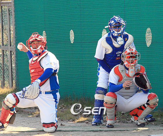 대표팀 안방 마님을 차지하기 위한 베테랑들과 젊은 피의 경쟁이 뜨겁다. 2008 베이징 올림픽 아시아 예선에 나설 대표팀에 선발된 4명의 후보 가운데 2명만 최종 엔트리에 선발돼 그야말로 피터지는 전쟁이 예고된 것. '베테랑' 진갑용(33, 삼성) 박경완(35, SK) 조인성(32, LG)과 '젊은 피' 강민호(22, 롯데)는 주전 마스크를 쓰기 위해 안간힘을 쏟고 있다. 코나미컵 출전 관계로 대표팀 훈련에 참가하지 못하고 있는 박경완은 팀의 한국시리즈 우승을 이끈 주역. 타율 2할4푼7리(352타수 87안타)에 불과하나 15차례 아치를 쏘아 올리며 일발 장타를 과시했다. 안정된 투수 리드와 블로킹, 도루 저지 능력은 단연 돋보인다. 국제 대회 경험이 적다는 것이 흠. 진갑용은 타율 2할4푼6리 89안타 5홈런 39타점 28득점으로 시즌 성적은 그다지 좋지 않으나 줄곧 대표팀의 주전 포수로 활약하며 풍부한 경험을 가지고 있다는 장점을 지니고 있다. 1998년 방콕아시안게임 금메달 획득과 지난해 월드베이스볼클래식 4강 기적에 기여한 경험이 있다. 역시 방콕 아시안게임 우승 멤버이자 지난해 WBC 주전 포수출신으로 올 시즌이 끝난 뒤 프리에이전트(FA) 자격을 얻은 조인성은 LG의 안방을 책임지며 타율 2할8푼2리 118안타 13홈런 73타점 44득점으로 포수라는 힘든 포지션임에도 불구하고 불방망이를 휘둘렀다. '앉아 쏴'라는 별명 답게 강한 어깨는 그의 트레이드 마크. '20대 포수의 선두 주자' 강민호는 지난해 전 경기에 출장하며 롯데 주전 포수로 자리매김한 뒤 올 시즌 125경기서 타율 2할7푼1리 112안타 14홈런 68타점 48득점으로 화끈한 안방마님의 위력을 보여줬다. 젊은 나이에도 불구하고 안정된 모습으로 차세대 국가대표 주전 포수로서 손색이 없다. 세대 교체를 감안한다면 그의 발탁 가능성도 그다지 낮지 않다. 두 자리를 놓고 치열한 경쟁을 벌이는 이들 가운데 누가 태극마크를 달게 될 것인지 주목된다. what@osen.co.kr 조인성(왼쪽)과 강민호가 투수들의 불펜피칭을 받아주고 있는 가운데 진갑용이 강민호 뒤에서 투구를 지켜보고 있다.