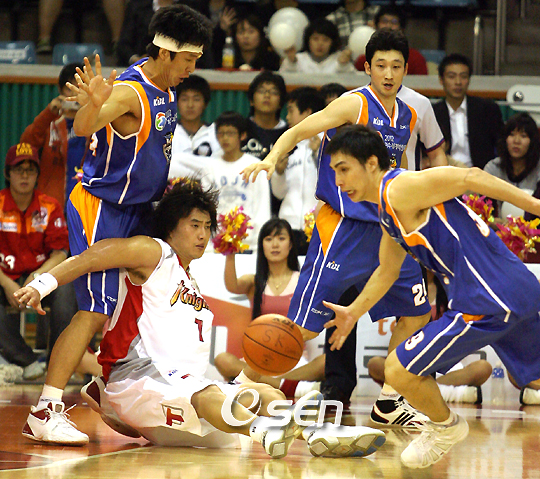 [OSEN=이상학 객원기자] 서울 SK가 자랑하는 ‘슈퍼루키’ 김태술의 기가 제대로 꺾였다. 지난 6일 안양 KT&G와의 홈경기에서 김태술은 11점·7어시스트·6리바운드로 활약했다. 그러나 팀은 74-82로 졌고 고비 때 턴오버 4개를 저지른 김태술에게도 패배의 책임이 없지는 않았다. 반면 김태술의 매치업 상대였던 포인트가드는 베테랑의 진면목을 제대로 발휘하며 한 수 지도했다. ‘테크노 가드’ 주희정(30·181cm)이 김태술에 한 수 지도한 주인공이었다. ▲ 베테랑의 꾸준함 김태술의 활약은 지난 2001-02시즌 김승현(오리온스)의 데뷔 당시를 연상시킬 정도로 큰 반향을 불러일으켰다. 김학섭(모비스)-표명일(동부)-신기성(KTF)-황성인(전자랜드) 등이 차례로 김태술 앞에서 쓰러졌다. 지난 4일 창원 LG와의 홈경기에서 팀은 대패했지만 김태술은 13어시스트로 괜찮은 활약을 펼쳤다. 하지만 KT&G전에서는 주희정을 맞아 고전을 거듭했다. 쉴 새 없이 코트를 활보하는 주희정의 활동량을 따라가는 데 다소 버거운 모습을 보였다. 이날 경기에서 17점·7어시스트·7리바운드를 기록한 주희정은 김태술과 기록적으로는 큰 차이가 없었다. 하지만 주희정은 승부처에서 빛을 발했다. 경기 막판 승부를 가른 KT&G의 11점 중 9점이 주희정의 손끝에서 나왔다. 이현호의 중거리슛, 마퀸 챈들러의 속공 덩크와 3점슛 모두 주희정의 손끝에서 비롯됐다. 마지막에는 자유투로 2점을 추가하며 직접 승부에 쐐기를 박았다. 김태술도 슈퍼루키답게 좋은 경기를 했지만, 경기 막판 턴오버와 한 템포 빠른 3점슛에서 나타나듯 승부처에서 주희정의 노련미를 따라가지는 못했다. 주희정은 올해로 어느덧 프로 11년차 베테랑이 됐다. 고려대 2학년을 중퇴, 연습생 신분으로 원주 나래(현 동부)에 입단한 주희정은 1997-98시즌 데뷔하자마자 신인왕을 차지하며 돌풍을 일으켰다. 이듬해 수원 삼성(현 서울 삼성)으로 이적한 이후 전성기를 열어젖혔다. 특히 2000-01시즌에는 팀의 정규리그-플레이오프 통합우승과 함께 플레이오프 MVP까지 차지했다. 하지만 주희정은 화려함보다는 성실함이 더욱 돋보이는 선수다. 프로농구 사상 첫 500경기 출전기록을 세우는 등 역대 최다 출장횟수(504게임)와 함께 통산 어시스트에서도 역대 1위(3274개)에 올라 있다. 지난 10년간 쉼 없이 쌓아올린 성실함의 표본이다. ▲ 스피드의 대명사 주희정은 전광석화와 같은 스피드가 장기다. 이상민(삼성)·김승현(오리온스)·신기성(KTF) 등 속공 전개 능력이 뛰어난 포인트가드들이 넘치지만 순수 스피드만 놓고 보면 주희정을 따라갈 수 없다는 평가. 무엇보다 주희정이 지휘하는 팀은 스피드가 빨랐다. 삼성에서 서장훈과 함께 한 3시즌 동안에도 삼성의 속공은 3-8-4위였다. 2005-06시즌 KT&G로 이적하자마자 팀 속공을 전체 1위로 올려놓은 선수가 바로 주희정이다. 지난 시즌에도 KT&G는 속공 3위로 빠른 농구를 구사했다. 주희정이 있기에 가능한 일들이었다. 사실 주희정은 이상민·신기성·김승현 등 정상급 포인트가드들에 비해 상대적으로 저평가되는 경우가 없지 않다. 고질적인 3점슛 약점 때문이다. 돌파와 속공 게임으로 득점을 올리는 재주가 있지만 3점슛이라는 아킬레스건이 발목을 잡았다. 특히 2002-03시즌 부분적인 지역방어 도입과 서장훈의 영입에 따른 세트오펜스 중심의 농구는 주희정에게 재앙과도 같은 일이었다. 하지만 KT&G로 이적한 이후에는 다시 자신에게 맞는 스피드 농구를 구사하며 본연의 모습을 되찾았다. 주희정에게 가장 확률 높은 농구는 세트오펜스가 아니라 속공이라는 것을 직접 증명해보이고 있는 것이다. KT&G도 이제는 주희정을 중심으로 돌아가고 있다. 지난 시즌 종료 후 양희승을 FA 계약 직후 KTF로 트레이드시킨 것도 결과적으로는 주희정에게 팀의 중심을 맡기겠다는 뜻이었다. 풀타임 첫 시즌을 치르고 있는 유도훈 감독도 주희정을 중심으로 스피드 농구를 구사할 것임을 천명했다. 실제로 KT&G는 올 시즌 8경기에서 경기당 평균 5.5개의 속공을 성공시키며 이 부문 전체 1위에 올라있다. 그 중심에 주희정이 있음은 두 말하면 잔소리다. 외국인선수 챈들러를 제외하면 확실한 공격 무기가 없는 KT&G에게도 질긴 수비와 스피드를 앞세운 속공만이 답이다. KT&G에게도 가장 확률 높은 농구는 속공뿐인 것이다. 공수양면에서 성실함과 스피드로 중무장한 주희정이 KT&G의 중심이 될 수 밖에 없는 이유다. 지난 6일 경기서 SK 방성윤이 KT&G 골밑을 파고들다 넘어지자 주희정이 볼을 가로채 속공을 펼치고 있다.