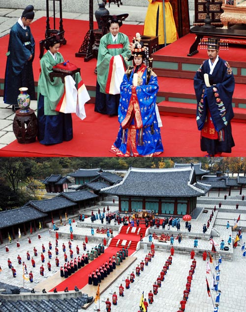 SBS 월화사극 ‘왕과 나’(유동윤 극본, 김재형 손재성 연출)가 4분 분량의 중전 책봉식을 위해 1억여원을 투입하는 정성을 들였다. 지난 11일 신문로 2가에 위치한 사적 271호 경희궁에서는 우리 전통문화 가운데 장엄하고 화려한 종합예술로 손꼽히는 조선왕조의 궁중연회를 재현했다. 이 연회는 음악이나 무용, 그리고 옷과 음식 등 모든 분야에서 당시 최고급 문화를 표현하고 통치이념도 담고 있는 역사적으로도 큰 의미를 담고 있는 중요한 행사였다. 드라마 ‘왕과 나’에서도 이 궁중연회 장면과 중전 책봉식은 가장 중요한 장면으로 손꼽힌다. 자혜로웠던 중전 공혜왕후(한다민 분)가 19세의 젊은 나이로 세상을 뜨자 정희대비(양미경 분), 인수대비(전인화 분), 그리고 한명회(김종결 분) 등 대신들은 자신들의 권력을 유지하기 위한 방편으로 새로운 중전을 앉히려고 했다. 하지만 임금 성종(고주원 분)이 자신의 아기를 낳은 소화를 중전으로 세울 것이라고 대비들과 대신관료들에게 강하게 주장하고 난 뒤에 이 같은 책봉식과 연회가 이뤄졌다. ‘왕과 나’ 팀은 고증을 통해 무대장치와 소품들을 설치했고 오만석, 구혜선, 고주원, 전광렬, 양미경, 전인화 등을 포함한 연기자, 국악연주와 무희, 조정관료, 상궁, 나인 등 보조출연자만 약 300여명을 투입해 조선 궁중연회 당시의 화려하고도 웅장한 절차와 의식을 재현했다. 여기에다 스태프까지 포함하면 이날 장면에만 400여명이나 되는 인원이 동원됐다. 약 4분여 정도 방송될 이 분량을 위해 제작진은 1억여원에 이르는 제작비를 투입하며 정성을 들였다. 출연진들과 제작진은 NG를 내지 않기 위해 충분한 리허설을 가졌고 오전 8시부터 시작된 촬영은 오후 7시까지 무려 11시간동안이나 쉴 새 없이 진행됐다. 수많은 보조출연자들은 “중전마마, 천복과 천수와 천귀를 누리시옵소서”라는 대사를 몇 번이나 반복 연습하기도 했고 무희로 등장한 출연자들은 카메라 각도에 맞춰 춤추는 곳인 지당판에서 계속 춤을 추며 완벽한 작품을 만들기에 여념이 없었다. 구혜선은 “공혜왕후가 세상을 뜬 이후에 뜻하지 않게 중전, 즉 국모가 됐는데 한편으로는 기쁘면서도 책임감이 더 크게 느껴진다. 이번 촬영을 계기로 연기자로서도 새로운 도약을 할 수 있도록 마음가짐을 새롭게 하겠다”는 소감을 밝혔다. 오만석은 “처선 역인 내가 궁에 들어와서 가장 바라던 바가 바로 성종과 소화가 부부의 연을 맺는 것이었는데 오늘에야 비로소 그 장면을 촬영하게 됐다. 실제로 내가 처선이었더라도 오늘을 정말 감격하며 받아들였을 것이다”라고 말하기도 했다. 김용진 CP는 “‘왕과 나’에서 소화가 중전으로 책봉되는 장면이 공개됨에 따라 드라마는 소화를 둘러싸고 이전과는 새롭고도 긴장감 넘치는 전개가 이뤄질 것”이라고 설명했다. 소화의 중전책봉식, 그리고 이를 축하하는 궁중연회 장면은 12일 방송된다. happy@osen.co.kr
