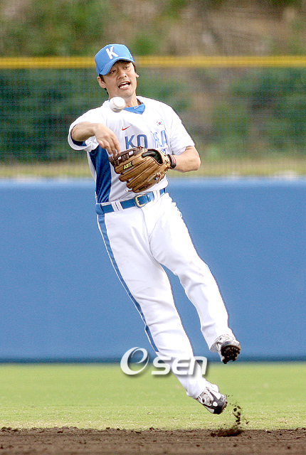 2008 베이징올림픽 대표팀이 12월 대만에서 열리는 아시아 예선대회 결전을 앞두고 전훈지인 오키나와 온나 아카마 구장에서 14일 오후 대표상비군과 연습 경기를 가져 5-5로 비겼다. 상비군의 6회초 무사 1루서 김태완의 내야땅볼 때 유격수 김민재가 점프스로로 1루주자 김주형을 2루에서 포스아웃시키고 있다./오키나와=김영민 기자ajyoung@osen.co.kr