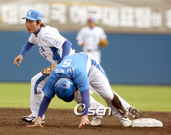2008 베이징올림픽 대표팀이 12월 대만에서 열리는 아시아 예선대회 결전을 앞두고 전훈지인 오키나와 온나 아카마 구장에서 14일 오후 대표상비군과 연습 경기를 가져 5-5로 비겼다. 상비군의 6회초 무사 1루서 김태완의 유격수 땅볼 때 1루주자 김주형이 2루에서 2루수 고영민에게 포스아웃되고 있다./오키나와=김영민 기자ajyoung@osen.co.kr