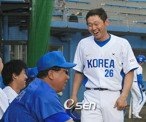2008 베이징올림픽 대표팀이 12월 대만에서 열리는 아시아 예선대회 결전을 앞두고 전훈지인 오키나와 온나 아카마 구장에서 14일 오후 대표상비군과 연습 경기를 가져 5-5로 비겼다. 8회말 1사 만루서 김민재의 볼넷으로 3루주자 박경완이 득점을 올리자 선동렬 수석코치가 "대주자로 나선 것이 처음 아니냐"며 농담을 건네고 있다./오키나와=김영민 기자ajyoung@osen.co.kr
