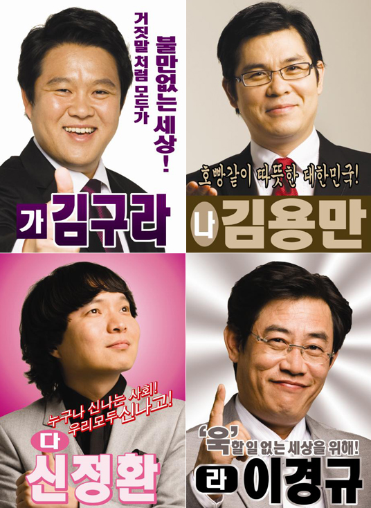 제 17대 대통령을 뽑는 선거 정국으로 대한민국이 뜨겁다. 이런 분위기를 발 빠르게 잡아탄 예능 프로그램이 있어 눈길을 끈다. SBS TV 토요 버라이어티 ‘라인업’이 오는 24일 방송분에서 모의 대선을 연다. 라인업 멤버들 중 4명의 후보를 선발해 선거에 나서게 하고 투표일까지의 전 과정을 세세히 묘사한다. 이 프로그램의 연출자인 김재혁 PD는 “유권자들의 투표율과 대선에 대한 관심을 높이기 위해 특별히 기획했다”고 의도를 설명했다. 일단 후보들의 면면들이 개성 넘친다. ‘욱! 할 일 없는 사회를 위해! 이경규’ ‘호빵같이 따뜻한 대한민국! 김용만’ ‘누구나 신나는 사회! 신정환’ ‘거짓말처럼 모두가 불만 없는 세상! 김구라’ 등의 기치가 나부낀다. 이경규 김용만 김구라 신정환이 대선 후보가 되어 열띤 유세를 펼치고 나머지 고정 패널들과 초대 손님은 보좌관이 되어 각자가 지지하는 후보들을 위해 분위기를 달군다. ‘라인업’의 모의 대선은 실제 대선의 단계를 모두 밟는다. ‘후보 합동 토론회’를 여는가 하면 ‘길거리 선거유세’는 실제의 대선과 동일한 방식으로 진행한다. 그리고 최종적으로 명동에 나가 시민들의 투표 참여를 통해 마지막 한 명을 뽑게 한다. 선거 참모들의 면면도 대단하다. 요즘 장안의 화제인 원더걸스를 비롯해 슈퍼주니어, 박현빈, 고영욱 등이 각자가 지지하는 후보를 위해 선거 유세에 나선다. 김구라를 지지하는 박현빈은 ‘오빠만 믿어’를 ‘구라만 믿어’로 개사해 선거송을 불러대고 원더걸스와 슈퍼주니어도 온갖 아이디어를 다 동원해 후보 띄우기에 나선다. 4명의 후보들이 한 자리에 모여 벌인 ‘후보 합동토론회’에는 거침없는 입담으로 유명한 박진영이 특별 출연해 날카로운 질문공세를 펼쳤다. 박진영은 “우리나라 연예계가 세계 시장에 진출해 성공할 수 있는 방안은 무엇인가”와 같은 질문으로 후보들의 진땀을 빼게 했다. 뿐만 아니라 이번 모의 대선에는 시원한 입담과 재미있는 강의로 명성을 얻고 있는 장경동 목사가 특별 출연해 청중을 사로잡는 스피치 전략을 전수하기도 한다. 100c@osen.co.kr ‘라인업-모의 대선’에 출마한 이경규 김용만 신정환 김구라의 대선 포스터.