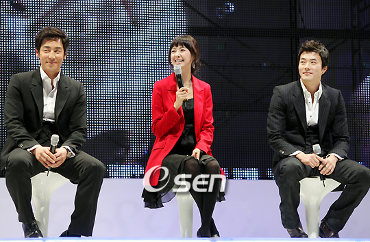 KBS 미니시리즈 '못된사랑'의 쇼케이스가 주연배우 권상우 이요원 김성수가 참석한 가운데 17일 경기도 고양시 KINTEX에서 열렸다. '못된사랑'은 영원한 사랑이라는 판타지에 기초한 여타 사랑이야기와는 차별화 된, 사랑의 솔직한 속마음을 거침없이 그려내 기존 멜로드라마의 고정관념을 깨뜨린 드라마이다. "권상우와 김성수 중 이상형을 한명 선택하라"는 사회자의 질문에 이요원이 "선택할 수 없다"며 미소짓고 있다. /황세준 기자 storkjoon@osen.co.kr