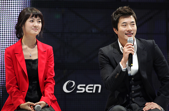 KBS 미니시리즈 '못된사랑'의 쇼케이스가 주연배우 권상우 이요원 김성수가 참석한 가운데 17일 경기도 고양시 KINTEX에서 열렸다. '못된사랑'은 영원한 사랑이라는 판타지에 기초한 여타 사랑이야기와는 차별화 된, 사랑의 솔직한 속마음을 거침없이 그려내 기존 멜로드라마의 고정관념을 깨뜨린 드라마이다. 이요원이 권상우의 발언에 귀 기울이고 있다. /황세준 기자 storkjoon@osen.co.kr
