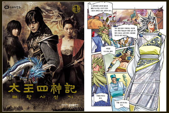 ‘태왕사신기’(MBC)의 열풍이 만화책까지 이어진다. 판타지 서사 드라마 ‘태왕사신기’의 국내 만화 1권이 출간됐다. 이미 일본에서는 유명 만화가 이케다 리요코씨에 의해 만화화되어 연재되고 있다. 국내에서도 ‘태왕사신기’를 만화책으로 볼 수 있는 것. 만화 ‘태왕사신기’는 류대영 씨가 각색을 하고 강신영 씨가 그림을 그려 쉽고 재미있게 각색됐다. 이번에 발행된 만화 ‘태왕사신기’ 1권에서는 쥬신의 왕이 태어날 때까지 봉인되어 있던 현무 청룡 백호 주작의 신물들이 쥬신의 별 아래 깨어나고, 같은 날 태어난 고구려 태자 담덕과 고구려 최고 귀족 연가려의 아들 호개가 쥬신의 왕 자리를 놓고 대립하기 시작하는 내용까지 담겨있다. ‘태왕시신기’는 OST 출시, 소설 발간에 이어 만화책까지 출간하면서 올해 최고의 화제작임을 입증하고 있다. crystal@osen.co.kr