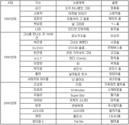 원더걸스 'Tell Me'의 인기 폭발과 함께 '텔미춤'이 큰 화제를 낳고 있는 가운데 역대 가요계를 돌이켜보면 노래와 더불어 춤이 이슈를 모았던 적이 많았다. 이에 음악사이트 쥬크온(www.jukeon.com)이 가요계 역대 히트춤과 노래를 총정리해 주위의 이목을 끈다. '텔미춤'은 80년대 레트로 시대의 음악을 접목해 어렵지 않으면서도 복고적인 동작으로 구성되어 있다. 이렇게 쉽게 따라 출 수 있는 춤은 과거 8,90년대 시절에 많았다. 이후 브레이크 댄스나 디스코가 유행하고 힙합이 국내에 상륙하면서 춤과 댄스음악들이 강세를 보이기 시작했다. 80년대 대표적인 춤을 살펴보면 '어젯밤 이야기'로 대표되는 '소방차춤', '널 그리며'를 통해 크게 유행했던 박남정의 'ㄱㄴ춤', '인디언 인형처럼'으로 유행했던 나미와 붐붐의 '토끼춤', '리듬속의 그춤을'로 데뷔한 섹시 여성가수 김완선의 '웨이브춤' 등 이었다. 90년대로 가보자. '오직 하나뿐인 그대'의 심신이 유행시킨 '권총춤', '그녀를 만나기 100m전'의 주인공 이상우의 귀여운 '피노키오춤', 국내 힙합의 선두주자 현진영의 '흐린 기억 속에 그대'에서 보여준 '고고춤', 서태지와 아이들의 데뷔작 '난 알아요'의 '회오리춤'이 당시 큰 인기를 끌었다. 이외에도 '날개 잃은 천사'로 모든 국군장병들의 마음을 설레게 했던 룰라의 '엉덩이춤', '캔디'에서 보여준 아이돌의 원조 H.O.T.의 '망치춤', DJ DOC의 'DOC와 춤을'에서 유행한 '관광버스춤', 80년대 복고스타일을 완벽하게 재연한 박진영의 ‘그녀는 예뻤다’와 ‘수영춤’, 테크노 댄스곡 '와'로 이정현의 '부채춤' 등 역시 90년대를 강타했던 대표적인 춤들이다. 2000년대 이후 댄스음악은 어떨까. '텔미춤'의 창시자인 박진영을 비롯해 채연, 이효리, 쥬얼리, 세븐, 비, 원더걸스 등 타고난 춤꾼들이 가세하며 다양한 춤들을 선보였다. 채연의 ‘나나나춤’을 비롯, 이효리의 ‘시계태엽춤’, 최근 활동에 어려움을 겪고 있는 아이비의 '마귀춤’이 많은 인기를 모았다. 이제는 노래뿐만이 아니라 춤의 인기도 무시할 수만은 없는 시대다. 또 앞으로 어떤 댄스가 유행을 몰고올지 흥미를 끄는 대목이다. yu@osen.co.kr 시대별 대표 노래와 춤. /쥬크온 제공.