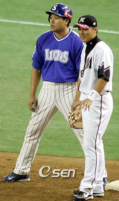 ‘위풍당당’ 양준혁(38.삼성)이 거침없는 입담을 과시했다. 양준혁은 지난 21일 밤 방송된 MBC ‘황금어장-무릎팍 도사’에 스포츠 선수로는 처음으로 출연, 연예인 못지 않은 입담으로 자신의 야구인생, 결혼관 등에 대해 솔직하게 털어놨다. 그중에서도 눈길을 끈 대목은 삼성에서 함께 뛰었던 후배이자 ‘국민타자’인 이승엽(31.요미우리)에 대한 이야기였다. 프로 데뷔 후 선후배에 밀려 늘 2인자에 머물렀다는 양준혁은 이승엽에 대해 2가지 점에서 ‘고마움’을 표했다. 첫 번째는 ‘새카만 후배이지만 배울 것이 많은 스승이었다’는 것이고 두 번째는 ‘만년 2인자’의 설움을 날려버릴 수 있게 일본으로 간 것을 꼽았다. 양준혁은 이승엽이 오른 다리를 드는 타격으로 한 해 홈런 54개를 때린 다음 시즌에는 다리를 내리고 아시아홈런 신기록을 세운 것을 보고 끊임없이 변화를 주는 점을 배웠다고 밝혔다. 이승엽의 노력하는 모습에 자신도 ‘만세타법’으로 스타일에 변화를 주는 등 오늘날에 이르렀다며 이승엽이 스승이었다고 털어놓았다. ‘각종 타격부문 통산 최고 기록을 갈아치우고 있다’는 MC 강호동의 물음에 양준혁은 “장종훈 선배의 통산 홈런(340개)에 9개 남았다. 내년에 기록을 세울 수 있을 것 같다. 승엽이가 없는 덕분이다”면서 “승엽아. 고맙다. 일본에서 열심히 하라”고 말해 MC들을 모두 웃게 만들었다. 이밖에도 양준혁은 고향팀 감독이 되고 싶어 삼성에 입단한 비화와 타구단의 ‘백지수표’ 제안, 트레이드됐을 때 심정과 복귀한 과정, 선수협 시절 및 메이저리그 메츠의 스카우트 제의 등에 대해 밝혔다. 또 몸에 맞는 볼을 맞고도 별로 아프지 않는 표정으로 걸어나가는 것은 투수와의 ‘기싸움’에서 밀리지 않기 위함이고 빈볼 시비때는 사실 적당한 선에서 기싸움을 벌이다가 들어간다는 등의 야구판 관행도 소개했다. ‘한 번 꽂히면 미친다’는 양준혁은 ‘결혼도 ‘꽂히는 여자’와 하고 싶다. 집에 세탁기만 사오면 된다‘면서 결혼하고 싶은 노총각의 심정을 엿보이기도 했다. sun@osen.co.kr 지난 2005년 코나미컵서 이승엽과 1루 옆에 나란히 서 있는 양준혁.
