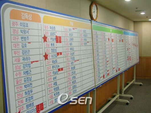 26일 K리그 베스트 11이 가려졌다. K리그를 취재하는 기자들의 투표로 11명의 선수와 감독이 가려진 가운데 이번 해는 비교적 편중 현상 없이 기록에 의해 선정됐다는 평가를 받고 있다. 이근호 vs 데닐손의 치열한 경쟁 가장 치열한 승부가 펼쳐진 포지션은 포워드였다. 올 시즌 득점왕인 까보레가 총 92표 중 83표를 얻어 최다 득표의 영예를 얻은 가운데 이근호와 데닐손이 치열한 경쟁을 한 것. 개표 결과 32대 31로 이근호의 한 표차 승리. 혹시 있을지 모를 실수에 대비해 재검표까지 갔으나 결국 이근호가 1표 차이로 생애 첫 K리그 베스트11의 영광을 얻게 됐다. 이근호는 인터뷰에서 "믿기지 않는다" 며 만족감을 표시했다. 포항, 최다 수상자 배출 우승팀 포항은 감독상을 비롯해 총 4명의 수상자를 배출했다. 제공권이 좋은 수비수 황재원을 비롯해 김기동, 따바레즈와 세르지오 파리아스 감독이 올해의 감독상을 수상했다. 이는 지난해 우승팀 성남이 감독을 포함해 총 5명을 배출한 것과 비교했을 때 한 명이 줄어든 수치다. 팀 성적보다는 개인 성적 위주로 바뀐 투표 성향 이번 베스트 11 결과를 통해 투표 성향이 팀 성적과 이름값보다는 개인 성적 위주로 바뀌고 있음을 알 수 있었다. 11명의 선수들 중 올해 첫 베스트 11의 영예를 안은 선수는 6명으로 50%를 넘어갔다. 또한 예전처럼 반 시즌만을 뛴 선수가 베스트 11에 오르는 등의 비정상적인 경우는 없었다 골키퍼 부문에서 상을 받은 김병지(서울)가 좋은 예다. 팀은 비록 아쉽게 6강 플레이오프에 진출하지 못했지만 김병지는 38경기에서 단 25실점을 기록하는 발군의 실력을 보여주었다. 라이벌 이운재가 음주 파동으로 단 한표도 얻지 못한 가운데 김병지는 정성룡, 김용대 등 차세대 골키퍼들도 여유있게 제치면서 생애 4번째 베스트 11에 이름을 올렸다. 아깝게 베스트 11에 이름을 올리지 못했지만 많은 선수들이 개인 기록을 통해 많은 득표를 했다. 올 시즌 국내 선수로 최다 공격포인트(10골, 6도움)를 기록한 김상록과 19득점 3도움을 기록한 데얀(이상 인천)등이 좋은 예라고 할 수 있다. 주요 후보들 0표 수모 주요 후보들이 단 한 표도 얻지 못한 것도 눈에 띄는 대목이다. 특히 수원의 차범근 감독과 서울의 귀네슈 감독이 단 한 도 얻지 못한 것은 다소 의외다. 차 독은 플레이오프에서 포항에게 패한 것이 컸고 귀네슈 감독 역시 아쉽게 6강 플레이오프에 오르지 못한 것이 그 원인으로 보여진다. 한편 신인왕을 놓고 경합을 벌이고 있는 김형일(대전)과 하태균(수원)은 득표수에서 희비가 엇갈렸다. 김형일은 수비수 부문에서 12표를 얻은 반면 하태균은 공격수 부문에서 단 한 도 얻지 못했던 것. 이같은 결과가 신인왕 투표에 영향을 미칠지는 두고볼 일이다. bbadagun@osen.co.kr