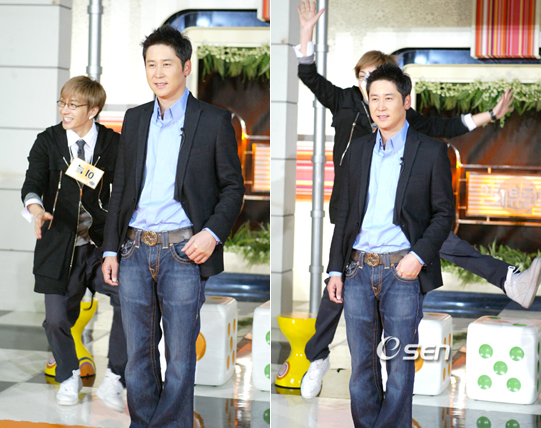 명 MC 신동엽과 슈퍼주니어 13인의 멤버가 함께 만드는 SBS TV '일요일이 좋다'-'인체탐험대'의 제작진이 27일 오후 경기도 부천체육관에서 녹화 현장을 공개했다. 그 동안 모르고 지냈던 우리 몸의 신비로운 작용들을 재미있는 형식에 담아 알아보는 프로그램이다. 진행자인 신동엽이 포토타임을 갖는 사이 이특이 뒤에서 장난을 치고 있다. /부천=강희수 기자 100c@osen.co.kr