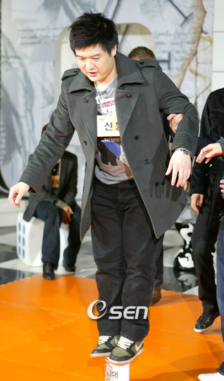 명 MC 신동엽과 슈퍼주니어 13인의 멤버가 함께 만드는 SBS TV '일요일이 좋다'-'인체탐험대'의 제작진이 27일 오후 경기도 부천체육관에서 녹화 현장을 공개했다. 그 동안 모르고 지냈던 우리 몸의 신비로운 작용들을 재미있는 형식에 담아 알아보는 프로그램이다. 슈퍼주니어 신동이 조심스럽게 깡통 위에 오르고 있다. /부천=강희수 기자 100c@osen.co.kr