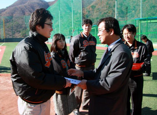 롯데 자이언츠가 아쉬웠던 2007 시즌을 마감하고 내년 시즌 도약을 다짐했다. 롯데는 30일 김해 상동야구장에서 구단 납회를 개최했다. 이날 행사는 ▲국민의례 ▲우수 선수 및 프런트 시상 ▲신인 선수 소개로 진행됐다. 구단 최우수선수로 선정된 이대호(25)는 상금 300만 원, 우수선수 박현승(35)은 상금 100만 원, 임경완(32)과 정보명(27)은 각각 투수와 타자 부문 공로상, 프런트 부문 공로상을 수상한 김태석 기록원, 최규덕 계장, 서미정 사원은 30만 원 상당의 백화점 상품권을 받았다. 하영철 사장은 이날 선수단의 변화를 강조했다. 하 사장은 "제리 로이스터 신임 감독을 중심으로 선수단 전원이 힘을 합쳐야 한다"며 "팬들이 '가을에도 야구하자'는 소원을 반드시 이뤄야 한다"고 말했다. 이어 하 사장은 "선수단 모두가 열정을 가지고 의지를 불태워 내년 시즌에는 사직구장을 잔치의 장으로 만들자"고 덧붙였다. 한편 롯데는 내달 5일부터 상동구장에서 자율 훈련을 실시하고 내년 1월 10일부터 팀 훈련에 돌입할 예정이다. what@osen.co.kr 이상구 롯데 단장이 프런트 부문 공로상 수상자에게 시상하고 있다. / 롯데 자이언츠 제공.