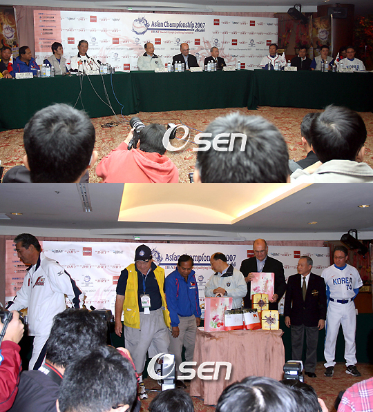 주객이 전도된 손님맞이. 베이징 올림픽 예선 개막을 하루 앞둔 30일 오후 개최국 대만은 4개국 감독이 참가하는 기자회견을 겸한 리셉션을 열었다. 결전에 임하는 한국, 일본, 대만 3강의 감독 출사표를 듣기 위해 타이중 시내 에버그린 호텔은 각국 기자들로 인산인해를 이뤘다. 그러나 결론부터 얘기하자면 김경문, 호시노, 궈타이위안 감독은 '병풍'이나 다름없었다. 어이없게도 4개국 감독은 좌우 구석에 배치됐고, 정중앙 자리는 타이중 시장과 국제야구연맹 회장 그리고 대만야구협회장의 차지였다. 행사가 시작된 뒤에도 이들 3인의 인사말로 전체 시간의 70%는 족히 지나갔다. 4개국 감독은 딱 1분씩만 '프리 토킹' 할 수 있는 시간이 주어진 것이 전부였다. 이후 추가 질문 시간이 있었지만 미디어를 위한 통역이 준비돼 있지 않아 대만 기자만 궈타이위안에게 질문 1개를 한 것이 전부였다. 이 와중에 최약체 필리핀 감독은 "동남아시아 챔피언인 우리의 다음 차례는 아시아 최강이다"라며 대만 측을 향해 "미안하지만 이기겠다"라고 뜬금없는 발언을 해 헛웃음을 짓게 만들었다. 또 필리핀 관계자는 호텔 직원에게 미니 카메라를 건네주고 타 3개국 감독과의 기념 촬영을 부탁하는 촌극을 연출하기도 했다. 이어 타이중 시장 등 개최측 3인방이 감독들을 배경삼아 사진 촬영을 끝낸 뒤에야 소위 '리셉션'은 종료됐다. 호시노 감독은 불쾌한 듯 곧바로 자리를 떴다. 김경문 감독은 한국 기자들을 위해 따로 시간을 내 오승환의 엔트리 탈락 경위와 감독자 회의의 결정 사항을 설명해줬다. 이 자리에서 김 감독은 "미국 달러인지 대만 달러인지 잘 모르겠는데 이닝을 마치고 공을 관중석에 던져주면 100달러를 벌금으로 내야 한다"란 '엽기 규정'을 들려줬다. 결과적으로 한국과 일본에서 타이중을 찾은 수백 명의 외신 기자들과 감독들은 들러리만 선 꼴이 됐다. 왜 대만에서 국제대회만 열렸다 하면 텃세부터 걱정해야 되는지 짐작하고도 남을 만했다. sgoi@osen.co.kr 타이중=손용호 기자 spjj@osen.co.kr