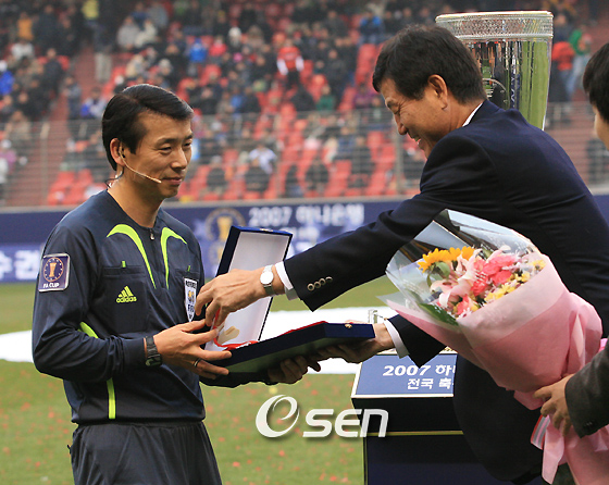 "무난히 심판 생활을 마무리하게 돼 기쁘다". 18년간 그라운드를 누비며 한국 축구계의 '포청천'으로 통했던 권종철(44) 심판은 "기분이 좋다"는 짤막한 은퇴 소감을 밝혔다. 2일 오후 3시 포항 스틸야드에서 펼쳐진 2007 하나은행 FA컵 2차전에서 주심을 맡은 권 심판은 역시 과감하고 칼날같은 판정으로 큰 경기를 무난하게 이끌었다. 경기를 마친 뒤 취재진과 만난 권 심판은 "무난하게 큰 어려움없이 이 생활을 마쳐 다행스럽다"는 속내를 전하며 "평상시대로 휘슬을 불기 위해 노력했다"고 담담한 소회를 전했다. 이날 가족이 처음으로 경기장에 찾아왔다고 밝힌 권 심판은 "이번 경기를 준비하며 체력 훈련을 열심히 했고, 아직 내가 뛸 수 있지만 은퇴한다는 것을 보여주고 싶었다"고 말했다. 권 심판은 "국내에 있는 국제심판 대상자 모두가 충분히 좋은 심판으로 성장할 수 있는 가능성을 보여주고 있다"며 같은 길을 걷고 있는 후배들에게 조언을 남겼다. 가장 기억에 남는 경기로 2002 남북 통일축구대회를 꼽은 권 심판은 "K리그 플레이오프 때 독일 주심들에게 자리를 내줬는데 아쉬운 한편 책임감을 느꼈다"고 밝혔다. yoshike3@osen.co.kr 전반전 종료 후 권종철 심판이 은퇴식서 김재한 대한축구협회 부회장으로부터 공로패를 받고 있다./포항=김영민 기자ajyoung@osen.co.kr