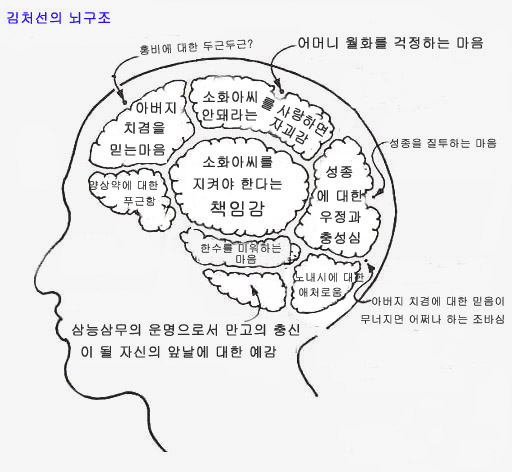 그동안 안방극장에 주인공을 보조하는 역할로만 등장했던 내시가 당당히 안방극장의 주연 자리를 꿰차며 순정과 당당함을 갖고 있는 내시의 모습을 보여주고 있는 김처선. 그는 평상시 어떤 생각을 하고 살까. SBS 월화사극 ‘왕과 나’(유동윤 극본, 김재형, 손재성 연출)에서 오만석(32)이 연기하고 있는 김처선의 뇌구조가 공개돼 많은 인기를 끌고 있다. 인기드라마 주인공들의 경우 그들의 뇌구조가 어김없이 등장하고 있는 가운데 한 포털사이트 ‘왕과 나’ 갤러리에서는 자신을 ‘만돌린’이라 밝힌 열혈네티즌이 김처선의 뇌구조를 자세하게 분석해 놓아 네티즌들의 환호를 받고 있다. 그 네티즌이 만든 총 13개 항목에 이르는 처선의 뇌 한 가운데에는 자신을 내시로 이끈 폐비윤씨 소화에 대한 감정 즉 ‘소화아씨를 지켜야 한다는 책임감’이 가장 크게 자리 잡고 있다. 두 번째로는 자기목숨과도 바꿀 수 있는 ‘소화아씨를 사랑하면 안 된다는 자괴감’이 엿보인다. 이어 자신을 양아들로 삼고 내시로서의 본분을 지킬 수 있게 도와준 ‘아버지 조치겸을 믿는 마음’과 어릴 적 인연으로 친구와도 같은 임금 ‘성종에 대한 우정과 충성심’도 머리에서 비슷한 크기로 자리 잡고 있다. 그리고 이보다는 작은 크기지만 ‘삼릉삼무(三能三無)의 운명으로서 만고의 충신이 될 자신의 앞날에 대한 예감’과 ‘인생만사 일장춘몽’으로 유명한 ‘약상약에 대한 푸근함’ ‘할아버지 노내시에 대한 애처로움’, 그리고 자신을 괴롭히는 ‘한수를 미워하는 마음’도 눈에 띈다. 또 비록 점으로 표현됐지만 내시가 되면서 헤어지다시피 한 ‘어머니 월화를 걱정하는 마음’과 자신에게 홍시를 건네며 다가온 ‘홍비에 대한 두근거림’‘성종을 질투하는 마음’, 선왕의 독살과 관련해 ‘아버지 치겸에 대한 믿음이 무너지면 어쩌나하는 조바심’ 등도 처선의 뇌구조에서 일부분을 차지하고 있다. 이런 처선의 뇌구조 공개는 최근 ‘왕과 나’에서 내시부의 개혁을 주도하는 주인공 처선의 활동이 눈에 띄면서 그에 대한 관심과 사랑을 반영한 것으로 풀이된다. 한편 12월 3일에 방송되는 ‘왕과 나’ 29회분에서는 억울하게 세상을 뜬 소환내시의 상여를 내시부로 들이는 처선과 이를 저지하는 한수(안재모 분)의 대립이 극대화돼 긴장감 역시 최고조로 달할 것으로 보인다. happy@osen.co.kr