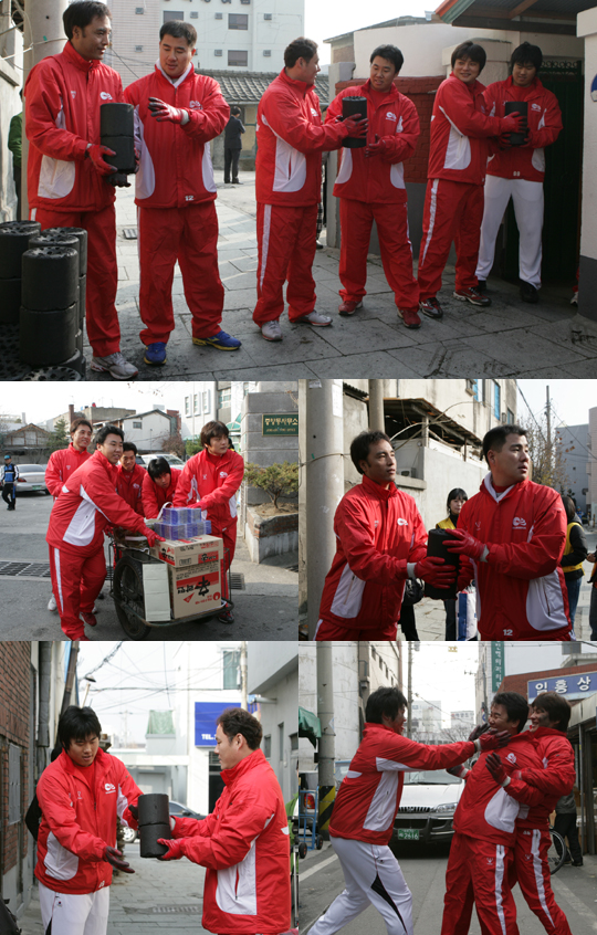 한화 이글스가 오는 6일 대전지역 독거 노인을 위한 '사랑의 연탄 배달' 행사를 실시한다. 오후 1시부터 실시 예정인 이번 사랑의 연탄배달 행사는 한화이글스 선수단 전체가 참석한 가운데 대전시 천동에 거주하는 독거노인 어르신들의 가정을 직접 방문하여 연탄 배달과 함께 즐거운 만남의 시간을 갖을 예정이다. 한화 이글스 선수단은 13명이 1조로 각 가구를 방문하여 1가구당 200장의 연탄과 함께 이불, 라면, 파스 등 독거 노인들에게 필요한 생필품을 직접 전달하게 된다. 대전광역시 동구지역 독거노인을 대상으로 1,000만원 상당의 연탄을 전달하게 되는 이번 행사는 선수단 상조회에서 기탁한 성금과 2007시즌 구단에서 실시하였던 사랑의 시구 성금, 대전야구장 외야 펜스에 설치 운영된 대덕테크노밸리 협찬의 ‘대덕테크노밸리 홈런존! ’에서 모아진 성금, 구단 지원 성금 등으로 운영된다. 선수단 주장인 정민철 선수는 “팬과 함께 하는 프로 스포츠 선수로서 더 많은 봉사활동을 해야 한다는 생각에 많은 선수들이 공감하고 있다. 외부에 노출되지 않는 선행 활동을 하는 선수도 많지만, 선수단 전체가 봉사 활동에 직접 참여한다는 것은 또 다른 의미가 있다. 주변의 어려운 분들을 위해 구단과 함께 지속적인 사회공헌 활동을 펼칠수 있도록 노력하겠다”며 소감을 밝혔다. 한화이글스는 지난 2001년부터 기념 시구, 홈런존을 통해 모아지 ‘한화이웃사랑 성금’으로 대전 지역 독거 노인을 위한 사랑의 쌀을 전달하였으며, 지난 2005년부터 선수단 전체가 직접 참여 배달하는 사랑의 연탄 배달 행사로 변경 실시하고 있다. 7rhdwn@osen.co.kr 한화 이글스 제공. 2006년 사랑의 연탄 행사 사진.