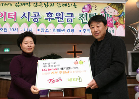 LG 트윈스 김재박 감독이 6일 서울시 노원구 중계동 천애재활원에 기부금 580만 원을 전달했다. 이번 기부는 김재박감독이 NHN과 ‘아름다운 재단’이 공동 운영하는 기부프로그램인 ‘해피빈’행사에 참여해 이루어 졌다. 김재박 감독은 1승당 10만원을 적립해 이날 장애우들에게 성금을 전달한 것이다. 한편 좌완 투수 봉중근도 이날 행사에 동참해 아이들과 함께하는 시간을 가졌다. 김재박 감독이 기부금을 전달하고 있다. /LG 트윈스 제공.