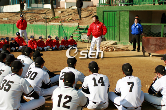 "오랜만에 오니 학창 시절의 추억이 떠오르네요". 10년 만에 모교를 찾은 이만수 SK 수석코치의 표정에는 미소가 가득했다. 이 코치는 8일 대구 상원고(전 대구상고)를 찾아 후배들과 즐거운 시간을 가졌다. 후배들의 타격 훈련을 지켜 보던 이 코치는 팔을 걷어붙이고 부족한 부분에 대한 조언도 아끼지 않았다. 이 코치의 원포인트 레슨을 받은 후배가 펜스에 직접 맞는 타구를 날리자 "그래, 좋았어"라고 엄지를 치켜세우며 용기를 북돋아 주었다. 훈련이 끝난 뒤 후배들을 위해 일일 강사로 나선 이 코치는 강한 정신력과 힘들어도 즐거운 마음으로 운동하라고 강조했다. 이 코치는 "타격은 점과 점을 맞추는 것"이라며 "끊임없는 연습과 연구를 하지 않으면 투수를 이길 수 없다"고 말했다. 이어 이 코치는 "SK가 한국시리즈 정상에 오를 수 있었던 것도 강한 정신력이 뒷받침되었기 때문에 가능했던 일"이라며 "경기에서 실력보다 어느 팀이 더 투지가 강하고 열심히 뛰느냐에 따라 승패가 좌우된다"고 역설했다. "즐기려는 마음 없이 훈련하는 것은 노동이나 다를 바 없다"고 목소리를 높인 이 코치는 후배들에게 "짧은 시간이라도 즐기는 자세로 연습해야 효과적이다"고 주장했다. 톱스타의 사소한 한 마디도 후배들에게는 피가 되고 살이 되는 셈. 상원고 입학 예정인 조원태(15)는 "그동안 알지 못했던 부분을 이해하기 쉽게 설명해주셨다"고 고마운 마음을 표현했다. 이 코치는 "오랜 만에 모교에 오니 감회가 새롭다"며 "후배들에게 조금이나마 도움이 되었으면 좋겠다"고 소감을 밝혔다. what@osen.co.kr . . . . .