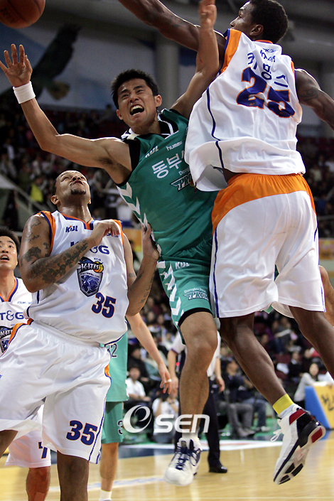 '2007-2008 SK텔레콤 T 프로농구' 정규리그 1위를 달리고 있는 원주 동부와 3위 안양 KT&G가 8일 안양 실내체육관에서 격돌해 KT&G가 83-77로 승리하며 전주 KCC와 동률을 이루며 공동 2위로 올라섰다. 동부 표명일이 KT&G 챈들러와 커밍스의 마크를 받으며 레이업슛을 쏜 뒤 충돌해 넘어지고 있다. /안양=황세준 기자 storkjoon@osen.co.kr