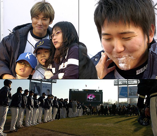 두산 베어스는 지난 8일 잠실야구장에서 팬과 선수의 만남의 자리인 '곰들의 모임' 환담회를 실시했다. 올해로 22번째를 맞은 이번 행사는 추운 날씨에도 불구하고 베어스클럽 회원을 비롯, 두산 관련 동호회 및 선수 팬클럽 회원, 또 참가를 원하는 모든 일반 팬 등 1000여 명이 참석, 김경문 감독을 비롯한 전 선수단과 함께 즐거운 시간을 가졌다. 이날 행사는 크게 1,2부로 나눠 진행됐으며 1부에서는 선수가 직접 야구에 대해 설명하는 '야구 클리닉'과 함께 선수단 '사인회 및 포토타임', '투구스피드 측정' 등의 게임이 자유로운 분위기 속에 진행됐다. 이어 올시즌 성원에 감사하는 김경문 감독의 인사와 함께 시작된 2부 공식행사에선 신인선수 소개, 송창훈 응원단장 은퇴 기념 시상식, 동호회 및 팬클럽이 선정한 각 부문별 수훈선수 시상식 등의 순으로 진행됐다. 또한 팬과 선수들이 함께 5인 5답 퀴즈, 섹시 커플댄스, 빼빼로로 양파링 옮기기, 선수단 장기 자랑 등의 즐거운 오락게임과 함께 행운권 추첨으로 전지훈련 무료 참관권과 선수용 롱코트, 친필 대형 사인볼 등을 증정하는 시간도 가졌다. 7rhdwn@osen.co.kr 두산 베어스 제공.