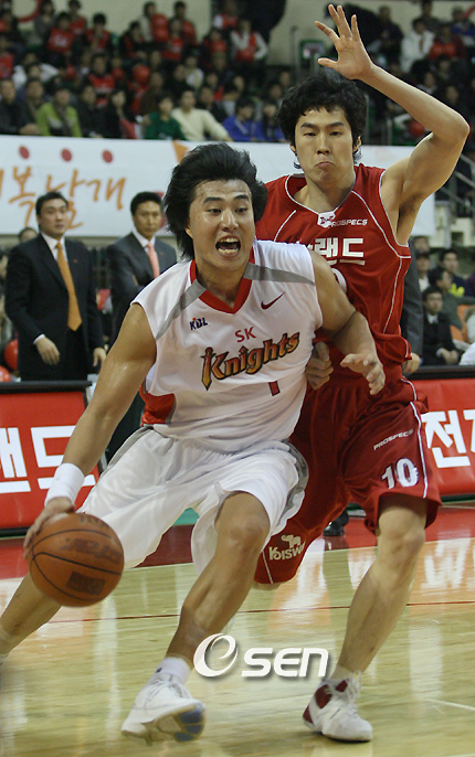 '빅뱅' 방성윤이 폭발한 SK가 전자랜드를 제물로 연패 탈출에 성공했다. 김진 감독이 이끄는 서울 SK는 서울 잠실학생체육관에서 열린 2007~2008 SK 텔레콤 T 프로농구 인천 전자랜드와 홈경기서 방성윤(29득점, 5도움, 4스틸)의 활약에 힘입어 83-76으로 승리했다. 이날 승리로 4연패 탈출에 성공한 SK는 11승9패를 기록하며 상위권 도약의 발판을 마련했다. SK와 전자랜드는 경기 초반부터 치열한 접전을 펼치며 경기를 풀어갔다. 원정팀 전자랜드는 테런스 레더와 카멜로 리를 이용한 골밑 득점을 올렸다. 반면 4연패의 늪에 빠져있던 SK는 '루키' 김태술이 3점슛과 함께 골밑을 파고들며 공격을 이끌었고 그 활약에 힘입어 SK는 1쿼터를 25-22로 근소하게 앞섰다. 2쿼터서 SK는 방성윤의 3점슛을 시작으로 새로운 외국인 선수 자시 클라인허드가 골밑 득점을 통해 힘을 내며 5분 28초경 43-33으로 달아났다. 이후 전자랜드는 이한권과 한정원의 3점슛으로 추격해 46-50으로 근소하게 뒤진 채 전반을 마쳤다. SK와 전자랜드는 3쿼터 초반 턴오버를 남발하며 제대로 득점을 올리지 못했다. 그러나 SK는 3쿼터 4분경 2개의 스틸에 이은 속공으로 득점을 올리며 59-51로 점수를 벌렸다. 하지만 SK는 이후 집중력이 흔들리며 전자랜드에 추격을 허용했다. 전자랜드는 이한권과 섀넌이 연속 득점하며 3쿼터 7분40초경 60-60으로 동점을 만들었다. 3쿼터를 근소하게 앞선 채 마친 SK는 4쿼터 시작하며 방성윤의 자유투와 이병석의 점프슛으로 먼저 기세를 올렸다. 또, 방성윤이 스틸에 이은 속공을 득점으로 연결해 4쿼터 2분40초경 72-66으로 점수를 벌렸다. 전자랜드도 기회는 있었다. 홈팀 SK가 스스로 턴오버를 범하며 무너지는 모습을 보였지만 전자랜드 역시 득점 찬스를 살리지 못하며 경기를 어렵게 끌고갔다. 결국 SK는 4쿼터 6분10초경 방성윤이 승부에 쐐기를 밖는 3점슛과 함께 래리 스미스의 화려한 덩크슛을 통해 점수를 벌리며 승리를 거두었다. ■ 9일 전적 서울 SK 83 (25-22 25-24 14-17 18-13) 76인천 전자랜드 10bird@osen.co.kr 3쿼터 SK 방성윤이 전자랜드 백주익의 마크를 뚫고 골밑을 돌파하고 있다./잠실학생체=김영민 기자ajyoung@osen.co.kr