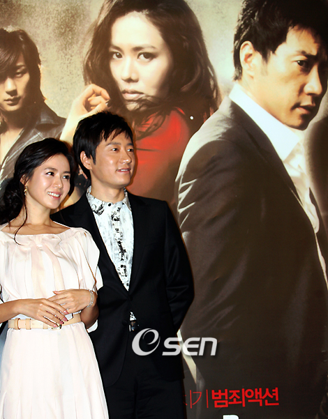 손예진과 김명민이 소매치기파의 리더와 형사반장으로 분한 영화 '무방비도시'의 제작발표회가 13일 용산 CGV에서 열렸다. 손예진이 국제 소매치기 조직을 이끄는 섹시팜므파탈 백장미역을 맡았고 김명민은 천부적인 형사 조대영역을 맡아 치명적인 대결을 펼친다. 영화에서 애증의 관계로 대결을 벌이는 손예진과 김명민이 포토타임을 갖고 있다./손용호 기자spjj@osen.co.kr