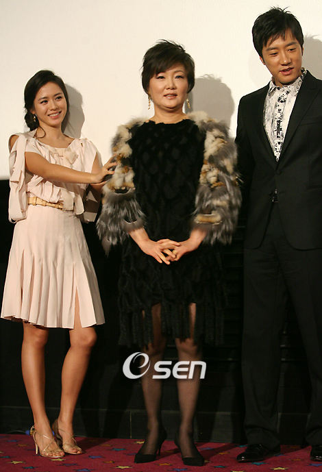손예진과 김명민이 소매치기파의 리더와 형사반장으로 분한 영화 '무방비도시'의 제작발표회가 13일 용산 CGV에서 열렸다. 손예진이 국제 소매치기 조직을 이끄는 섹시팜므파탈 백장미역을 맡았고 김명민은 천부적인 형사 조대영역을 맡아 치명적인 대결을 펼친다. 포토타임때 손예진이 선배 김해숙에게 먼저 하라고 등을 떠밀고 있다./손용호 기자spjj@osen.co.kr