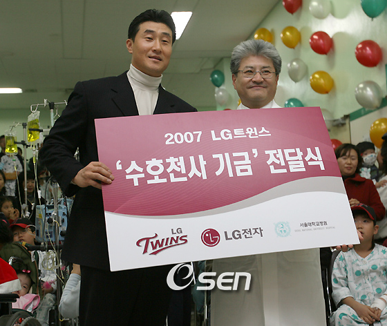 LG 트윈스가 서울대 어린이병원과 함께 진행하는 'LG트윈스 수호천사 기금' 전달 행사가 18일 낮 서울대 어린이병원에서 열렸다. 2007시즌 1년간 적립한 2000만 원 전달식과 박용택 이종렬 박명환 이승호가 참가한 가운데 사인회 및 즐거운 행사를 가졌다. 주장 이종렬이 김종성 서울대 어린이병원장에게 성금을 전달하고 있다./김영민 기자ajyoung@osen.co.kr