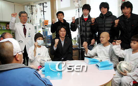 홍명보장학재단의 홍명보 이사장과 김상식(성남 일화) 김진규(FC 서울) 이요한(제주 FC) 김상록(인천 FC, 오른쪽부터)이 18일 오후 서울 신촌 세브란스병원 어린이 병동을 방문해 어린이 환자들을 위문하고 선물을 증정했다. 홍명보 이사장과 선수들이 사인볼을 전달하고 빠른 쾌유를 빌며 파이팅을 외치고 있다. /황세준 기자 storkjoon@osen.co.kr