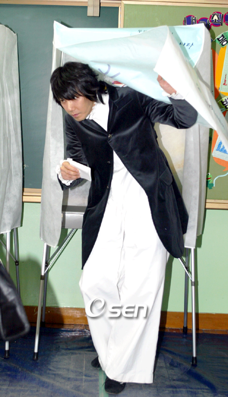 가수 김장훈이 19일 오후 경기도 고양시 일산구 가좌동 송포초등학교에 마련된 제 17대 대통령선거 고양 송산 3투표소에서 귀중한 한 표를 행사하고 있다. 지난 9년간 30억 원을 기부해 ‘기부천사’로 불리는 김장훈은 아직 서울 마포에서 월세살이를 하는 통에 주소지가 어머니가 살고 있는 가좌동으로 되어 있다. 오는 21일부터 시작되는 크리스마스 콘서트 ‘김장훈 원맨쇼’ 준비로 눈코 뜰 새 없이 바쁜 시간을 보내고 있는 김장훈은 중앙선거관리위원회 공익광고 모델로도 나서는 등 국민들의 투표 참여를 호소해 왔다. 신중하게 표를 찍은 김장훈이 기표소를 나서고 있다. /고양=강희수 기자 100c@osen.co.kr