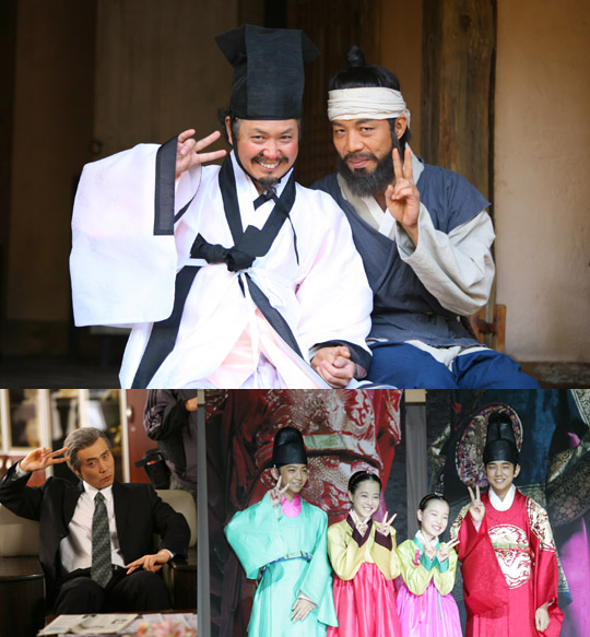 당신은 사진을 촬영할 때 어떤 포즈를 가장 많이 취하는가. 남녀노소를 불문하고 카메라 앞에서 자주 그리는 ‘V’ 포즈는 연기자라고 해도 예외가 아니다. SBS 드라마 각 홈페이지에 강남길과 안길강 등 중년 연기자를 포함한 많은 연기자들이 카메라 앞에서 손가락으로 ‘V’를 그리는 모습이 공개 돼 인기를 끌고 있다. ‘V’는 ‘승리’의 대표적인 표시다. 하지만 최근에는 디지털 카메라가 등장하고 사진기 앞에서의 포즈가 개성 표현이 되면서 ‘V’는 ‘승리’의 의미에다 ‘애교’라는 의미도 추가 됐다. 월화사극 ‘왕과 나’에서 내자원의 훈육선생 최참봉 역의 강남길과 도자장 개도치 역의 안길강이 손을 꼭 붙잡고 귀여운 ‘V’를 선보였다. 코믹한 연기를 선보이는 강남길과는 달리 극중에서 무뚝뚝한 캐릭터를 보여주고 있는 안길강이 보여준 깜찍한 ‘V’에 많은 네티즌들은 “개도치에게 저런 면이 있는지 몰랐다. 너무 귀엽다”“중년에게도 V는 있다”며 즐거워하고 있다. 지난 8월 있었던 ‘왕과 나’ 제작발표회에 참석한 유승호, 주민수, 박보영, 조정은 등 아역배우도 손가락으로 ‘V’를 그리며 즐거워하고 있다. 수목드라마 ‘로비스트’에서는 극중 해리(송일국 분) 아버지, 에바(유선 분)의 죽음과 관련있는 장태성 의원 역의 이재용 또한 손가락으로 ‘V’를 그려보였다. 평소 드라마 속에서 보여준 근엄한 모습과는 달리 그가 보인 다소 엉뚱한 ‘V’에 많은 팬들은 웃음을 그치지 못하고 있다. 스타들이 그리는 애교섞인 ‘V’. ‘V’를 그리며 해맑게 웃고 있는 그들이 드라마에서 보여주는 감동과 희망의 메시지에 팬들의 관심이 끊이지 않고 있다. happy@osen.co.kr