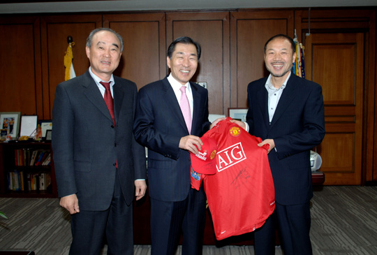 영국 연수를 마치고 돌아온 장외룡 인천 유나이티드 감독이 박지성으로부터 친필 사인이 적힌 유니폼을 선물로 가져왔다. 장외룡 감독은 20일 인천시청에서 안상수 구단주를 만나 귀국 인사를 나눴다. 이 자리에서 장외룡 감독은 박지성의 사인이 담겨있는 맨체스터 유나이티드 유니폼을 안 구단주에게 건네주었다. 안상수 구단주와 안종복 사장은 뜻밖의 선물을 받고 기뻐했다. 18일 런던에서 귀국한 장외룡 감독은 2008년 1월 7일 문학경기장에서 선수들과 사령탑 복귀 첫 훈련을 가질 예정이다. 인천은 1월 중순경 괌으로 전지훈련을 떠날 계획이다. 7rhdwn@osen.co.kr 인천 유나이티드 제공.