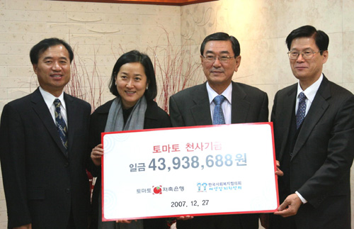 중견배우 박현숙이 소아암과 백혈병으로 투병 중인 저소득가정 어린이들을 돕기 위한 행사에 참여했다. 박현숙은 지난 27일 오전 11시 경기도 성남시에 위치한 토마토저축은행 본점 2층에서 홍보대사 위촉식을 갖고 이날 은행 측이 마련한 성금 4천400만원을 한국사회복지협의회 새새명지원센터에 전달했다. 이번 성금은 일명 천사모금운동으로 은행 임,직원이 매월 급여에서 1004원씩 기부하고 고객이 가입한 천사정기예금 이자 중 매월 1004원씩 기부하는 50:50 기부방식을 통해 모금됐다. 박현숙은 “소아암, 백혈병으로 투병 중인 어린이와 가족 여러분은 절대 포기하지 마시고, 완치할 수 있다는 꿈과 희망을 가졌으면 하는 바람입니다. 완치를 기원합니다”는 뜻을 전했다. yu@osen.co.kr