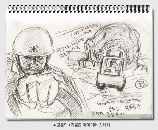 한국영화 최고 흥행작 ‘괴물’의 속편이 본격적인 제작에 들어갔다. 인터넷 유명 만화가 강풀(본명 강도영)이 시나리오 작가로 참여해 ‘괴물2’의 시나리오 초고가 완성된 상태다. 올해 촬영을 시작해 2009년 개봉 예정인 ‘괴물2’는 과연 소포모어 징크스를 깰 수 있을까? 소포모어 징크스는 데뷔와 함께 성공을 거둔 사람 혹은 작품이 두 번째에도 확실히 자리매김할 수 있을지에 대한 의문점을 표현하는 단어다. 영화계에서는 흔히 ‘전편만한 속편은 없다’는 속설로 통용된다. 지금껏 수많은 작품들이 전작의 흥행에 힘입어 속편을 선보였지만 전작을 뛰어넘는 흥행이나 이슈를 만들어내지 못했고, 혹독한 비판에 시달리는 경우가 많았다. 물론 ‘반지의 제왕’ 같이 몇몇 시리즈의 경우는 전편보다 차차 나아지는 경우도 있다. 지난 2006년 7월 말 개봉했던 ‘괴물’은 ‘왕의 남자’ ‘태극기 휘날리며’ ‘실미도’에 이어 1000만 관객을 돌파했고, 1300만명을 넘어서며 한국영화와 외화를 통틀어 국내에서 개봉된 영화 중 가장 많은 관객을 동원했다. 한강에서 출현한 괴물에게 납치된 딸을 구하기 위한 가족들의 사투가 중심 내용이다. 송강호 변희봉 박해일 배두나 고아성 등 배우들의 연기력과 봉준호 감독의 연출력도 빛났지만 CG로 완성한 한강 괴물은 국내 관객들의 시선을 사로잡았다. ‘괴물’ 성공 이후 속편 제작에 대한 얘기들이 오고가다 2008년 새해 들어 ‘괴물2’의 제작이 가시화됐다. 지금까지 알려진 ‘괴물2’에 대한 정보를 정리해보면 전편의 프리퀄의 형태로 5분 분량의 ‘괴물’ 프롤로그에 생략된 이야기들이 본격적으로 그려진다. 2000년 맥팔랜드 사건과 2006년 한강에서 괴물 출몰이라는 기간 사이의 목격담과 의문들이 결집된 과거의 이야기다. 전편보다 시간적 배경이 앞선 2003년이고, 한강 대신 청계천을 주 무대로 한다. 또 전편에 괴물 한 마리가 등장했다면 ‘괴물2’에서는 보다 많은 괴물들이 등장하며, 주요 주인공이 6명이라는 것 정도다. 2008년 여름 촬영을 시작해 2009년 개봉할 예정이며 제작비는 전편(110억원)보다 규모가 클 것이라는 게 제작진의 설명이다. ‘괴물’과 ‘괴물2’는 여러 가지 면에서 많은 관심을 끌고 있는 작품이다. 특히 17대 대통령으로 당선된 이명박 대통령의 큰 성과였던 청계천을 배경으로 해 정치적 의도가 포함되지 않을까라는 시선도 있다. 하지만 제작진은 이런 우려를 일축했고, 시나리오를 쓴 강풀은 “전편의 미덕을 이어가면서도 속편이 가지는 어려움과 한계를 극복하려 했다. 또한 다수의 괴물을 등장시켜 전편보다 강화된 액션을 보여주고 싶다”고 자신감을 내비쳤다. ‘괴물’이 가진 한국영화 최고 흥행작이라는 타이틀을 속편인 ‘괴물2’가 과연 뛰어넘을 수 있을지 귀추가 주목된다. pharos@osen.co.kr 강풀의 ‘괴물2’ 아이디어 스케치./ 청어람 제공.