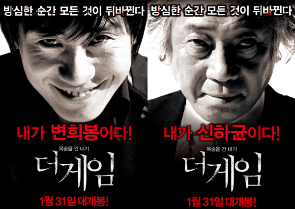 영화 ‘더 게임’(윤인호 감독, 프라임엔터테인먼트 제작)이 이색적인 벽보로 눈길을 끌고 있다. ‘더 게임’의 벽보는 신하균과 변희봉이 얼굴과 이름을 서로 뒤바꾼 일명 크로스 벽보다. ‘방심한 순간 모든 것이 뒤바뀐다’라는 카피에 맞게 음흉하게 웃음을 머금고 있는 날카로운 눈빛의 신하균 밑에 ‘내가 변희봉이다’는 카피가, 변희봉의 얼굴 아래는 ‘내가 신하균이다’는 카피가 호기심을 증폭시킨다. 이는 피할 수 없는 단 한번의 내기로 인해 젊음 인생 육체 등 모든 것이 송두리째 뒤바뀐다는 영화적 설정에 따른 독특한 아이디어에서 비롯됐다. 영화 속에서 변희봉은 강노식에서 민희도로, 신하균은 민희도에서 강노식으로 서로 배역을 크로스하는 파격적인 연기 변신을 감행했다. 신하균 변희봉의 ‘더 게임’은 오는 31일 개봉한다. crystal@osen.co.kr (주)프라임엔터테인먼트 제공.