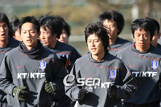 2010 남아공월드컵 본선 진출을 향한 허정무호의 첫 항해가 시작됐다. 허정무 감독과 정해성 수석코치 등 코칭스태프와 20명의 대표팀 선수들은 강도 높은 체력훈련으로 스타트를 뗐다. 27일 오후 파주NFC에서 진행된 대표팀 소집 공식 첫 훈련에서 대표팀 선수단은 10여 분간의 가벼운 스트레칭과 15분간의 러닝으로 서서히 몸을 푼 뒤 본격적인 훈련에 돌입했다. 이날 훈련의 포커스는 체력. 백호구장 터치라인에서 셔틀런 훈련이 진행됐다. 반 데를레이 피지컬 트레이너의 휘슬 소리에 맞춰 그라운드를 가볍게 뛰던 선수들은 아직 컨디션이 정상이 아닌 터라 금세 지친 기색이 역력했다. 오후 3시 15분. 허 감독과 김현태 GK코치 등 대표팀 스태프가 지켜보는 앞에서 선수들은 각기 2명씩 짝을 지어 50m 왕복 달리기 훈련이 시작됐다. 겉으로는 쉽게 보여도 50m 거리를 7차례 오가고 나면 쉽게 지칠 수 밖에 없었다. 시즌이 끝나고, 한참을 쉬었던 선수들의 표정은 일그러졌고, '헉헉'거리는 거친 숨소리가 필드를 울렸다. 핌 베어벡 감독 체제에선 거의 볼 수 없었던 체력 훈련이었다. 김현태 코치는 "여기까지만 달려와라"고 외치며 점점 발걸음이 무거워지는 선수들을 독려했고, 허 감독 역시 "빨리 못뛰어"라고 소리를 질렀다. 조진수-정조국, 황지수-염기훈, 박원재-조원희, 김남일-이관우, 조성환-황재원, 조용형-곽희주, 곽태휘-김치우, 이종민-이동식, 김병지-염동균 등 주로 포지션에 맞춰 짝을 이뤘다. 대다수 조가 1분대를 훌쩍 넘어선 가운데 가장 빠른 기록을 올린 선수는 이번에 처음 선발된 제주 유나이티드 소속의 골게터 조진수. 57초를 기록해 코치진의 칭찬을 받았다. 조진수의 뒤를 이어 조원희(수원), 구자철(제주), 염기훈(울산) 순으로 1분 이내를 기록했고, 가장 느린 이는 주장 김남일(빗셀 고베)과 김병지(서울) 등이었다. 허 감독은 김병지가 멋쩍은 표정으로 운동장 중앙에서 패싱 훈련을 하던 선수단에 합류하기 위해 돌아서자 "예전의 (김)병지가 아니야"라며 미소를 지어보이기도 했다. 한편 허 감독은 모든 훈련을 마친 뒤 "솔직히 원하는 100% 상태는 아니지만 그렇다고 아주 실망할 정도는 아니다"라며 "며칠 훈련을 진행하며 몸 상태를 서서히 끌어올리겠다"고 선수들의 체력 상태를 설명했다. 가볍게 몸을 푸는 정도로 마칠 것이란 예상과는 달리 처음부터 강도 높은 체력 테스트를 진행한 허 감독 체제에서 대표팀 선수들에게 여유는 없어 보였다. yoshike3@osen.co.kr