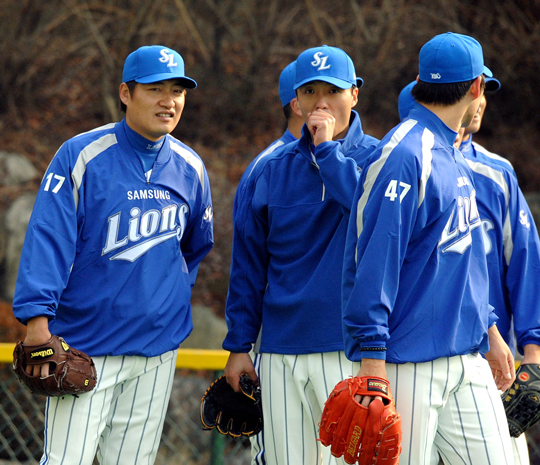 지난 9일부터 괌에서 한국시리즈 우승을 위한 담금질에 나선 삼성의 선발진 경쟁은 관록과 패기의 대결. 지난해 팔꿈치 인대 접합 수술을 받은 뒤 올 시즌 팀에 복귀하는 '토종 에이스' 배영수(27)와 외국인 투수 웨스 오버뮬러(32)가 원투 펀치로 낙점된 가운데 남은 세 자리를 놓고 치열한 경쟁을 벌이고 있다. 후보는 '노장파' 이상목(37)-전병호(35)-조진호(33), '젊은 피' 정현욱(30)-윤성환(27)-차우찬(21). 지난 시즌이 끝난 뒤 고향팀인 삼성 유니폼을 입은 이상목은 팀내 투수 최고참의 경험을 앞세워 선발 한 자리를 차지할 각오. 지난 해 11경기에 등판, 1승 4패(방어율 6.69)에 그쳤지만 주무기인 포크볼을 비롯한 다양한 변화구와 관록이 돋보인다. "고향팀에서 '유종의 미'를 거두겠다"는 강한 의지도 이상목의 부활에 힘을 실어준다. 지난 해 삼성 선발진 가운데 외국인 에이스 제이미 브라운(31)에 이어 가장 안정된 구위를 선보인 '흑마구의 달인' 전병호는 노장파 가운데 가장 강력한 후보다. 120km 안팎의 직구에도 불구하고 구석 구석을 찌르는 절묘한 코너워크와 다양한 변화구, 노련한 경기 운영 능력이 돋보이는 전병호는 지난해 32경기에 출장, 8승 8패 2홀드(방어율 4.06)를 따냈다. 메이저리그 출신 우완 조진호는 '국보 투수' 출신 선동렬 감독으로부터 제구력은 합격점을 받았다. 선 감독은 대구지역 언론사와의 인터뷰를 통해 "(조)진호는 볼이 낮게 제구되는 것이 강점"이라고 평가한 뒤 "그러나 구위가 떨어지는 것이 흠"이라고 지적했다. 2004년 병역 파동으로 그라운드를 떠난 뒤 경기 감각과 체력을 어느 만큼 키우느냐가 관건이다. 국방의 의무를 마치고 지난 시즌 중반 팀에 합류한 정현욱은 150km에 육박하는 직구와 커브가 위력적인 우완 정통파 투수. 11차례 마운드에 올라 승리 없이 1패 1세이브(방어율 5.52)에 머물렀으나 괌 마무리 훈련을 통해 기량이 급상승했다. 성실한 훈련 태도 덕분에 선 감독의 총애를 받는 정현욱은 올 시즌 선발 한 자리를 꿰차며 이름을 알릴 각오다. '커브의 달인' 윤성환은 '젊은 피' 가운데 선발 진입 가능성이 가장 높은 편. 지난해 주로 중간 계투로 뛰며 3승 8홀드(방어율 1.04)로 짠물 투구의 진수를 보여줬다. 시즌이 끝난 뒤 올림픽 상비군으로 선발된 윤성환은 대표팀 타선을 상대로 위력적인 구위를 뽐내며 올 시즌 돌풍을 예고했다. 선 감독도 "이번 괌 전훈을 통해 윤성환과 차우찬의 기량이 부쩍 좋아졌다"고 기대를 감추지 않았다. 군산상고를 졸업한 뒤 2006년 삼성에 입단한 좌완 차우찬은 사자 마운드의 떠오르는 샛별. 고교 시절 특급 좌완으로 명성을 떨쳤던 차우찬은 입단 후 이렇다할 활약을 보여주지 못했으나 마무리 훈련과 스프링 캠프를 통해 실력이 한 단계 성장했다. 차우찬은 "지금까지 프로에 대한 적응기간이라고 보고 올해 선발 한 자리를 차지하고 싶다"고 욕심을 숨기지 않았다. 선발 세 자리를 놓고 불꽃 튀는 접전을 벌이는 '노장파'와 '젊은 피' 대결에서 누가 마지막에 웃을지 지켜볼 일이다. what@osen.co.kr 전병호-이상목=삼성 라이온즈 제공. . . . .