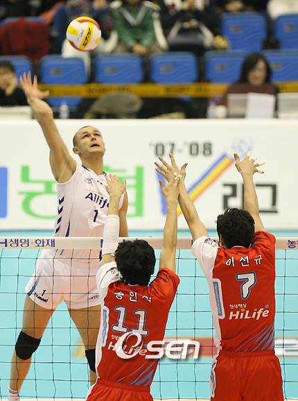트리플 크라운을 달성한 안젤코의 활약에 힘입어 삼성화재가 라이벌전에서 웃었다. 3일 올림픽 제2체육관에서 펼쳐진 2007-2008 V리그 남자부 4라운드 서울 중립경기서 삼성화재는 현대캐피탈에 세트스코어 3-1(22-25 25-23 25-17 25-20)로 역전승, 3연승을 달렸다. 삼성화재는 현대캐피탈의 4연승을 저지했으며 16승 3패를 기록, 1위를 굳건히 지켰다. 현대캐피탈은 13승 6패. 삼성화재는 안젤코가 서브득점 4점을 포함, 36득점을 올리며 승리의 일등공신이 됐고 석진욱(12득점)과 고희진(11득점)도 팀 승리에 힘을 보탰다. 반면 현대캐피탈은 1세트를 챙기면서 좋은 출발을 했지만 세트스코어 1-1 상황서 3세트를 무기력하게 내주며 패하고 말았다. 첫 세트는 현대캐피탈이 높이를 앞세워 블로킹 득점으로 삼성화재를 먼저 제압했다. 한 점씩 사이좋게 주고 받으며 접전을 펼친 1세트 중반 16-16인 상황서 후인정이 장병철의 스파이크를 연속으로 같은 위치에서 가로막으면서 18-16으로 현대캐피탈이 먼저 달아났다. 균형이 깨지면서 현대캐피탈은 송인석의 득점을 앞세워 더욱 삼성화재를 몰아붙였고 결국 고희진이 네트를 건드리는 실책을 범하면서 현대캐피탈이 25-22로 1세트를 마무리지었다. 2세트 들어서는 삼성화재도 블로킹이 위력을 보이며 현대캐피탈의 높이에 맞대응했다. 2세트 블로킹 득점에서는 삼성화재(3득점)가 현대캐피탈(5득점)에 밀렸지만 삼성화재는 결정적인 순간 현대캐피탈의 스파이크를 가로막으며 2세트를 챙길 수 있었다. 2세트 후반 현대캐피탈은 안젤코의 스파이크를 송인석이 한 번, 박철우가 두 번 블로킹으로 막으면서 분위기를 압도하는 듯했지만 막판 삼성화재는 신선호와 고희진이 귀중한 블로킹 득점을 올리면서 2세트를 25-23으로 따내 세트스코어 타이를 이뤘다. 삼성화재는 상승세를 3세트에도 이어나갔다. 3세트에만 16득점(공격 10득점, 블로킹 3득점, 서브 3득점)을 올리면서 자신의 독무대를 만든 안젤코는 후인정의 퀵오픈을 가로막는 것을 시작으로 스파이크서브로 연속 3득점을 올리는 괴력을 선보였다. 반면 현대캐피탈은 후인정 송인석 오정록이 잇달아 안젤코의 서브를 받지 못하며 순식간에 3점을 내줬고 점수차가 벌어졌다. 3세트 들어 서브리시브가 급격하게 흔들린 현대캐피탈과 대조적으로 삼성화재는 안정된 서브리시브를 바탕으로 손재홍의 백어택, 신선호의 속공, 안젤코의 시간차 공격 등 자유자재로 공격을 성공시켰다. 현대캐피탈은 3세트 막판 주상용과 이선규가 블로킹 득점을 올리면서 쫓아갔지만 따라가기에는 점수차가 컸다. 4세트 들어 삼성화재는 다시 한 번 안젤코의 서브득점으로 현대캐피탈의 사기를 꺾었다. 송인석의 오픈 공격을 고희진이 단독으로 가로막으면서 삼성화재는 4세트를 10-8로 근소하게 앞서나갔다. 삼성화재는 끈질긴 수비를 바탕으로 리드를 지킨 끝에 송인석의 공격을 안젤코가 블로킹으로 끊으면서 현대캐피탈을 침몰시켰다. 한편 현대캐피탈의 송인석은 이날 공격 득점 1000점(3호)을 달성했으나 팀 패배로 빛이 바랬다. 7rhdwn@osen.co.kr 삼성화재 안젤코가 현대 송인석 이선규의 블로킹에 맞서 강타를 날리고 있다./올림픽제2체=김영민 기자ajyoung@osen.co.kr